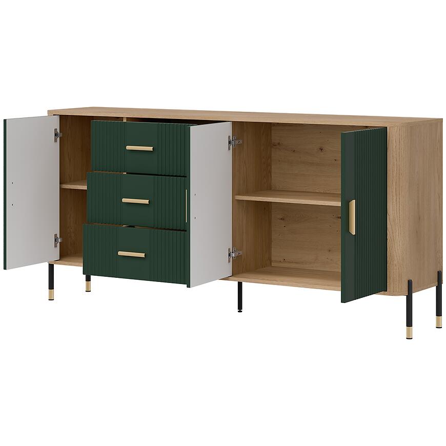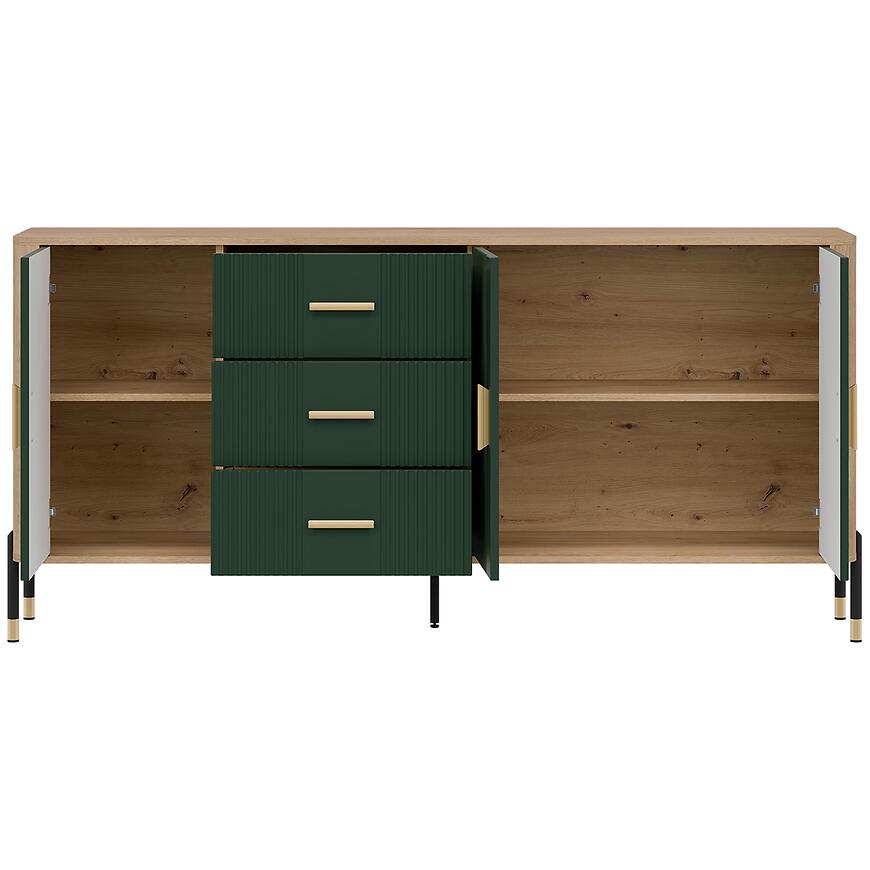 Fronty wykonano z trwałej płyty MDF w kolorze zielonym, a korpus z laminowanej płyty wiórowej w odcieniu dąb Cremona. Matowe wykończenie frontów i korpusu nadaje meblowi nowoczesny wygląd, a jednocześnie ułatwia codzienne użytkowanie i utrzymanie w czystości. Trzy pojemne szuflady zwiększają funkcjonalność komody, zapewniając wygodny dostęp do przechowywanych przedmiotów.