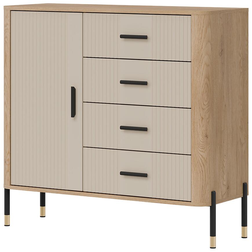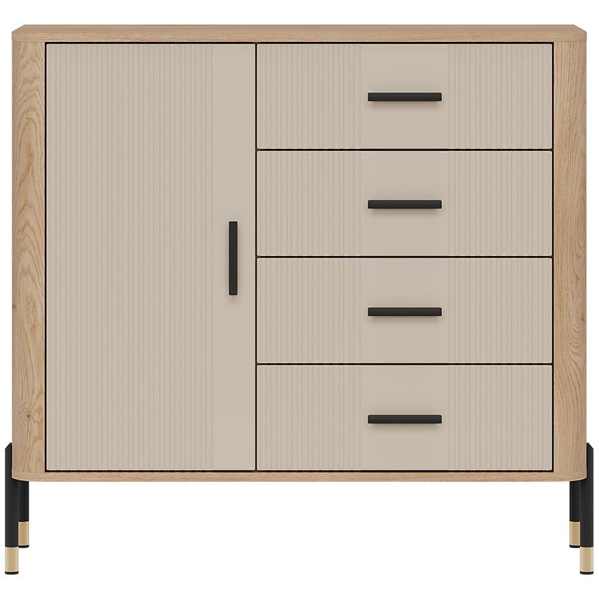 Fronty komody wykonano z płyty MDF w kolorze kaszmir, a korpus z laminowanej płyty wiórowej w odcieniu dąb Cremona. Takie połączenie materiałów zapewnia trwałość, odporność na codzienne użytkowanie i łatwość utrzymania czystości. Funkcjonalne szuflady pozwalają wygodnie przechowywać przedmioty codziennego użytku, pomagając zachować porządek we wnętrzu.