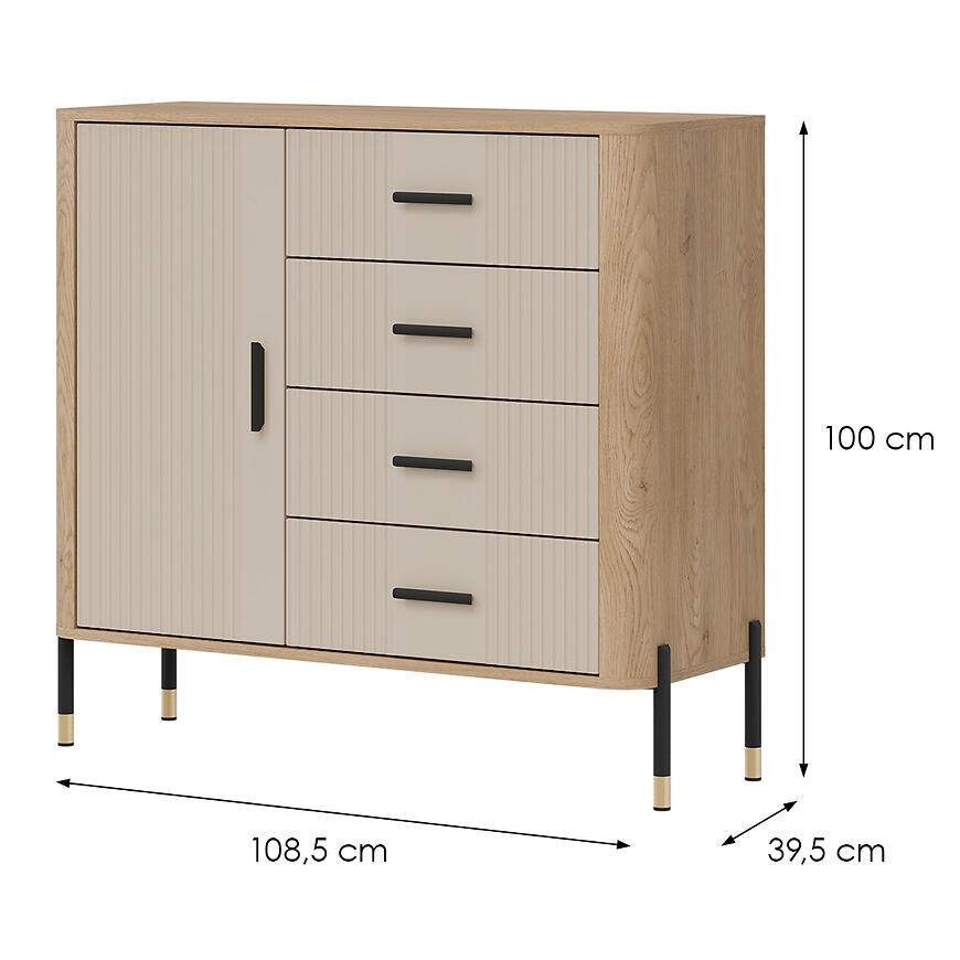 Komoda ma szerokość 108,5 cm, wysokość 100 cm oraz głębokość 39,5 cm, co zapewnia wygodną przestrzeń do przechowywania. Model posiada jedno drzwi oraz cztery lub więcej szuflad, które umożliwiają uporządkowanie różnych przedmiotów, takich jak tekstylia, dokumenty czy dekoracje, zachowując estetyczny wygląd bryły.