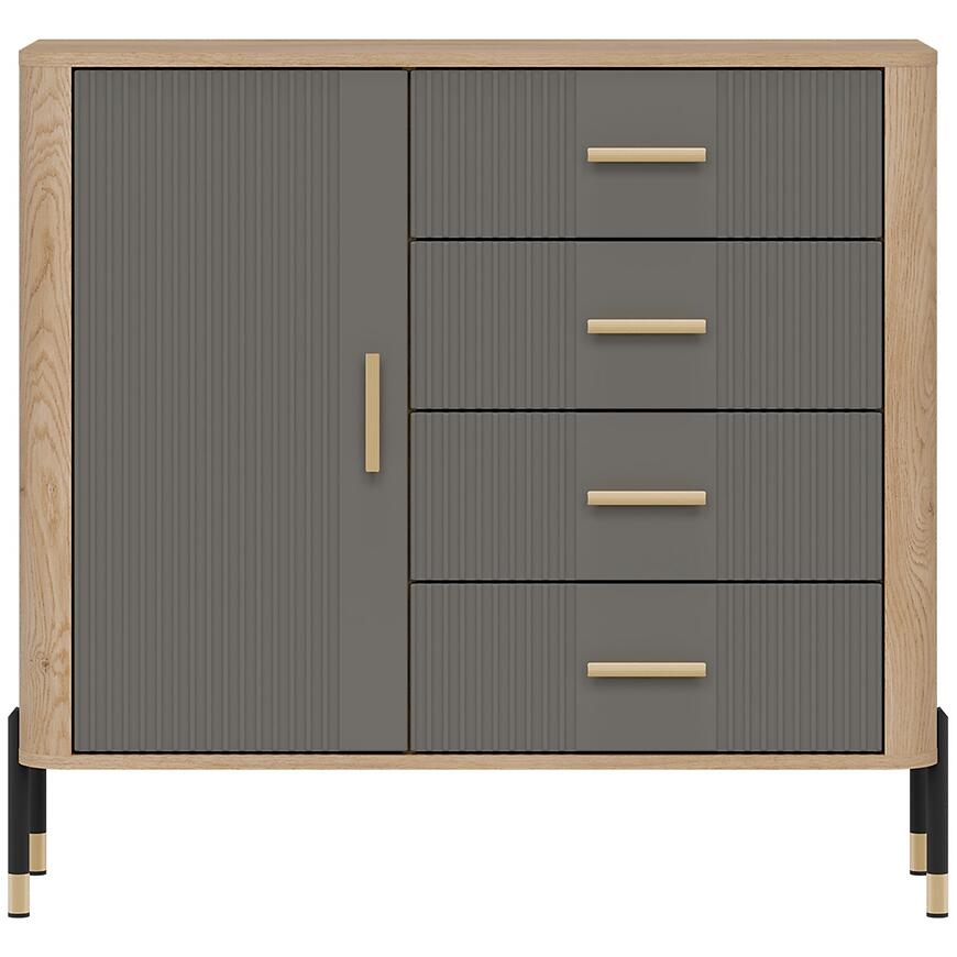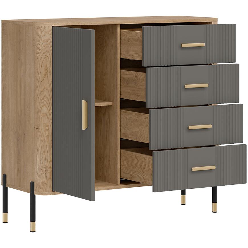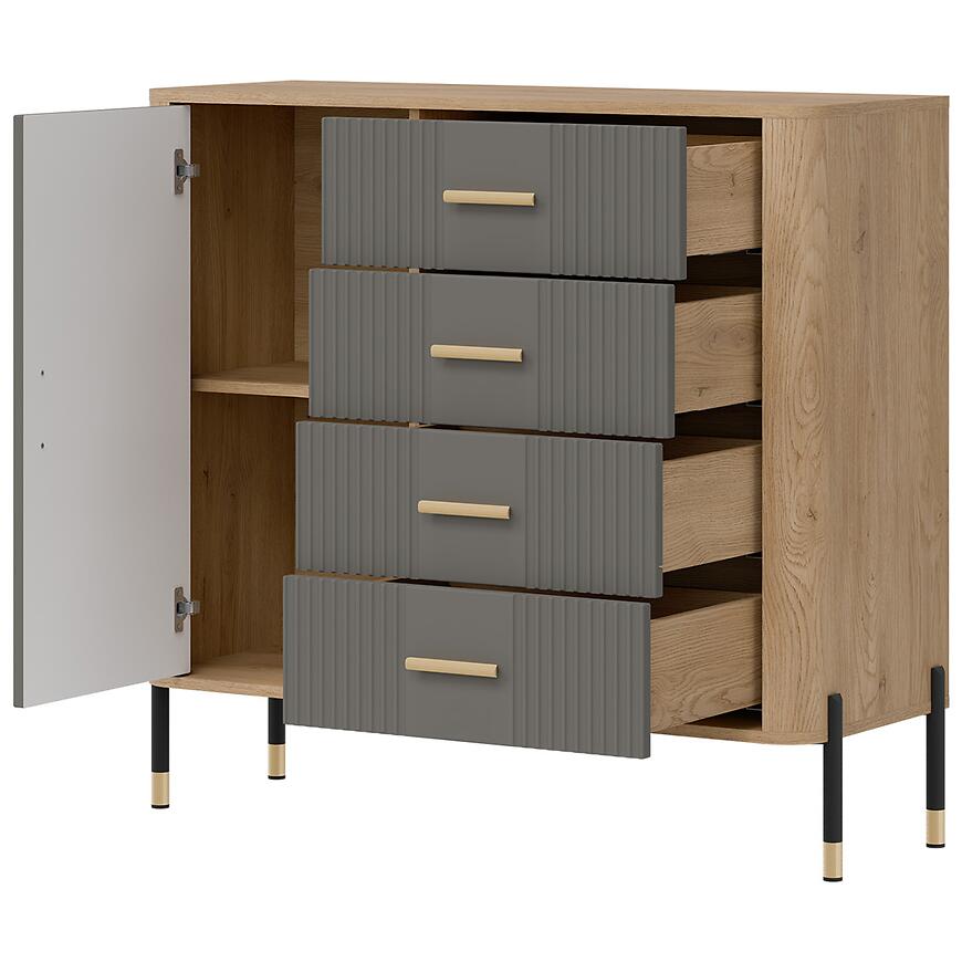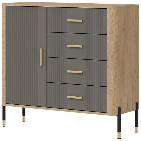 Fronty komody wykonano z płyty MDF w kolorze szarym, a korpus z laminowanej płyty wiórowej w odcieniu dąb Cremona. Takie połączenie materiałów zapewnia trwałość, odporność na codzienne użytkowanie oraz łatwość utrzymania czystości. Funkcjonalne szuflady pozwalają wygodnie przechowywać przedmioty codziennego użytku, pomagając utrzymać porządek we wnętrzu.