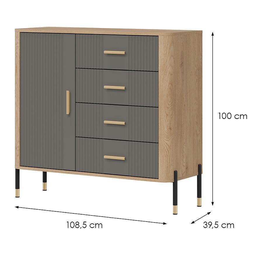 Komoda ma szerokość 108,5 cm, wysokość 100 cm oraz głębokość 39,5 cm, co zapewnia przestrzeń do przechowywania. Model posiada jedno drzwi oraz cztery lub więcej szuflad, które umożliwiają uporządkowanie różnych przedmiotów, takich jak tekstylia, dokumenty czy dekoracje, zachowując estetyczny wygląd bryły.