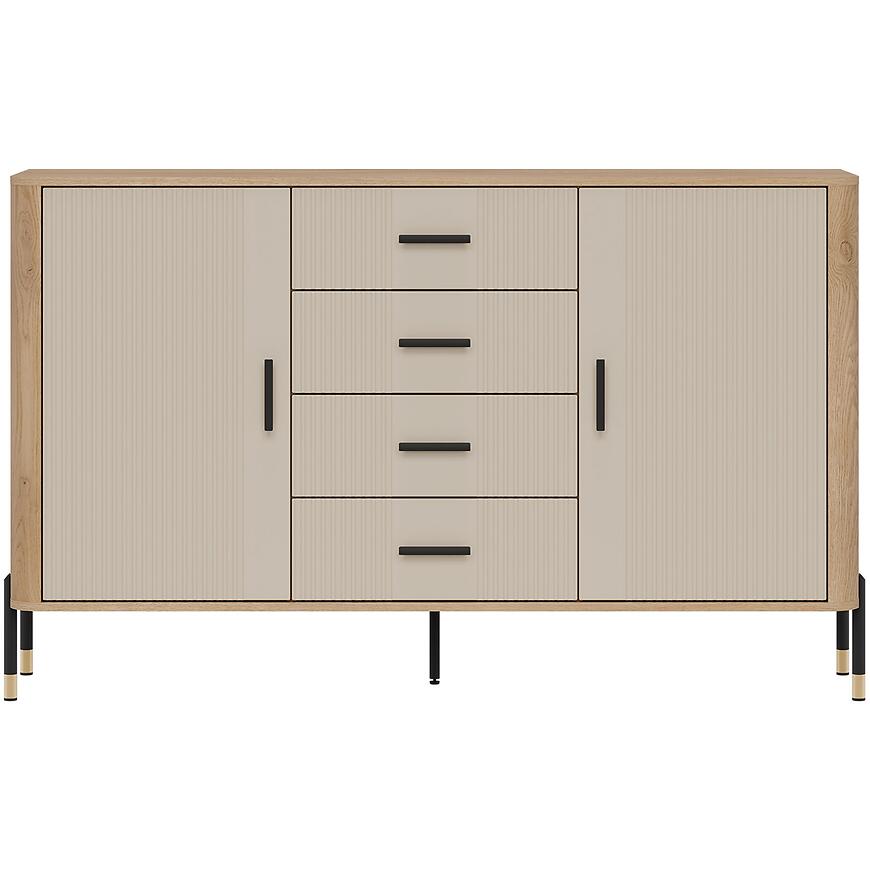 Komoda Dante Dt09 Dąb Cremona/Kaszmir to przestronny i elegancki mebel, który łączy nowoczesny design z funkcjonalnym przechowywaniem. Dwudrzwiowe fronty w kolorze kaszmir w matowym wykończeniu, zestawione z jasnym korpusem w odcieniu dąb Cremona, tworzą harmonijną i stylową kompozycję, idealną do nowoczesnych salonów, jadalni lub pokojów dziennych. Opcjonalne oświetlenie LED dodatkowo podkreśla charakter mebla i wprowadza przyjemny nastrój do wnętrza.