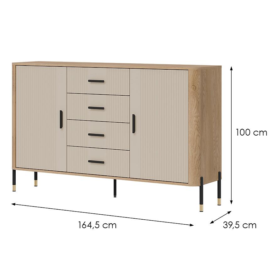 Komoda ma wymiary 164,5 cm szerokości, 100 cm wysokości oraz 39,5 cm głębokości, zapewniając dużą przestrzeń do przechowywania. Model posiada dwie drzwi oraz cztery lub więcej szuflad, które umożliwiają wygodne przechowywanie tekstyliów, dokumentów, dekoracji czy innych przedmiotów, zachowując estetyczny wygląd bryły.
