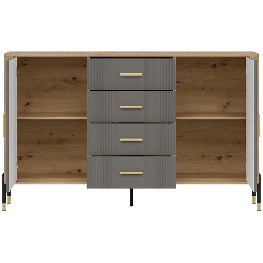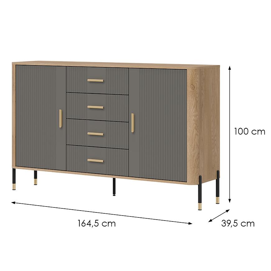 Komoda ma szerokość 164,5 cm, wysokość 100 cm oraz głębokość 39,5 cm, zapewniając dużą przestrzeń do przechowywania. Model posiada dwie drzwi oraz cztery lub więcej szuflad, które umożliwiają wygodne przechowywanie tekstyliów, dokumentów, dekoracji czy innych przedmiotów, zachowując estetyczny wygląd bryły.