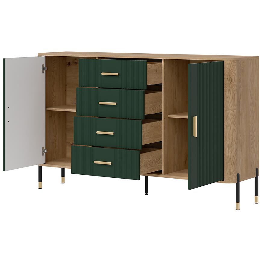 Komoda Dante Dt09 Dąb Cremona/Zielony to przestronny i elegancki mebel, który wprowadza do wnętrza świeży, nowoczesny akcent kolorystyczny. Dwudrzwiowe, matowe fronty w zielonym kolorze w połączeniu z jasnym korpusem w odcieniu dąb Cremona tworzą harmonijną i stylową kompozycję, idealną do salonu, jadalni lub pokoju dziennego. Opcjonalne oświetlenie LED dodatkowo podkreśla charakter mebla i nadaje wnętrzu przyjemny nastrój.