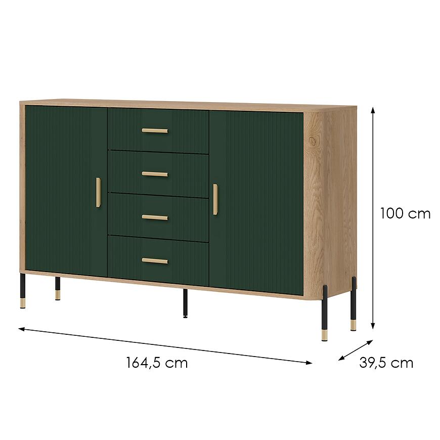 Komoda ma wymiary 164,5 cm szerokości, 100 cm wysokości oraz 39,5 cm głębokości, zapewniając dużą przestrzeń do przechowywania. Model posiada dwie drzwi oraz cztery lub więcej szuflad, które umożliwiają wygodne przechowywanie tekstyliów, dokumentów, dekoracji i innych przedmiotów, zachowując estetyczny wygląd bryły.