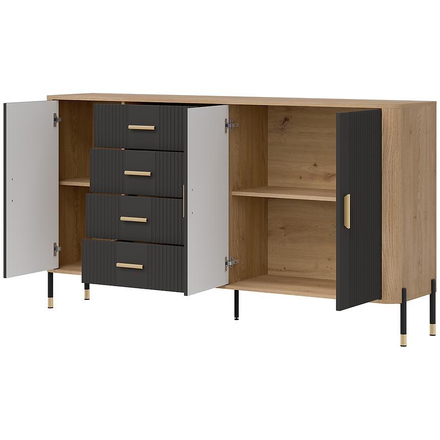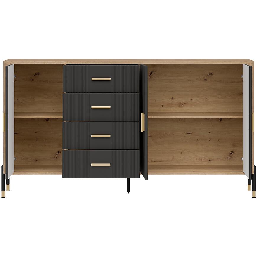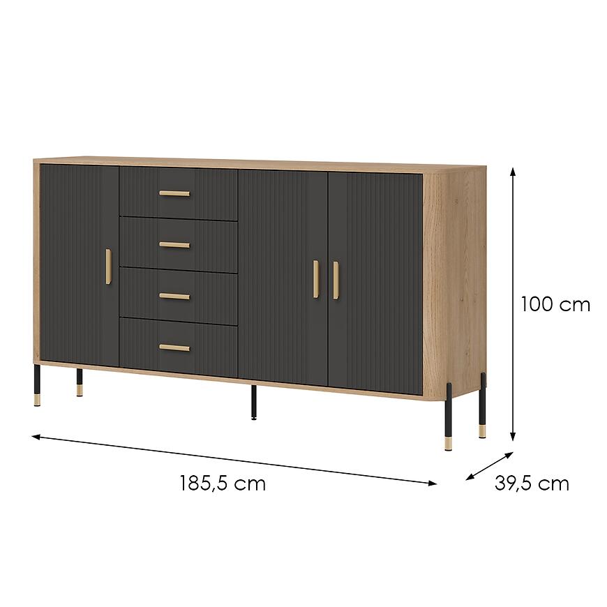 Komoda ma wymiary 185,5 cm szerokości, 100 cm wysokości oraz 39,5 cm głębokości, co zapewnia dużą przestrzeń do przechowywania. Model posiada trzy drzwi oraz cztery lub więcej szuflad, umożliwiając wygodne przechowywanie tekstyliów, dokumentów, dekoracji i innych przedmiotów, zachowując estetyczny wygląd bryły.