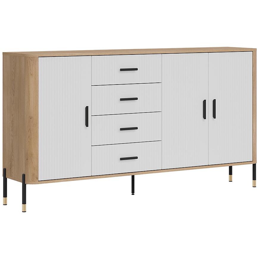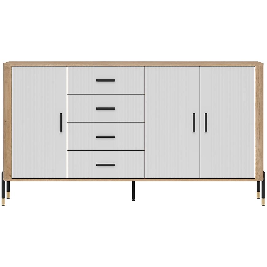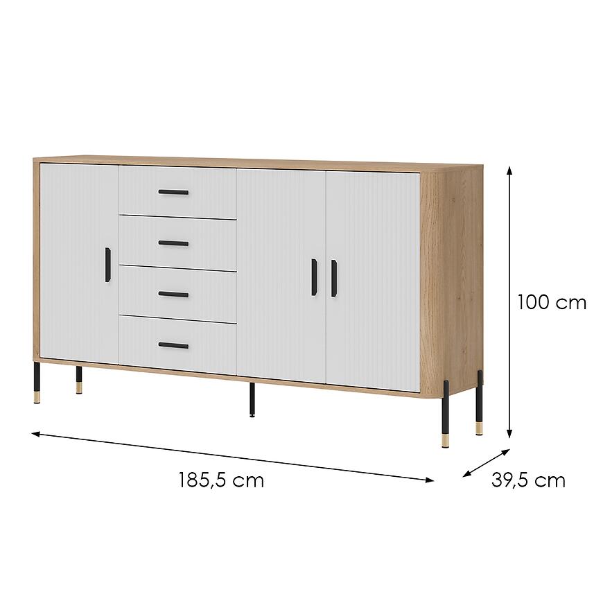 Komoda ma wymiary 185,5 cm szerokości, 100 cm wysokości oraz 39,5 cm głębokości, co zapewnia dużą przestrzeń do przechowywania. Model posiada trzy drzwi oraz cztery lub więcej szuflad, umożliwiając wygodne przechowywanie tekstyliów, dokumentów, dekoracji i innych przedmiotów, zachowując estetyczny wygląd bryły.