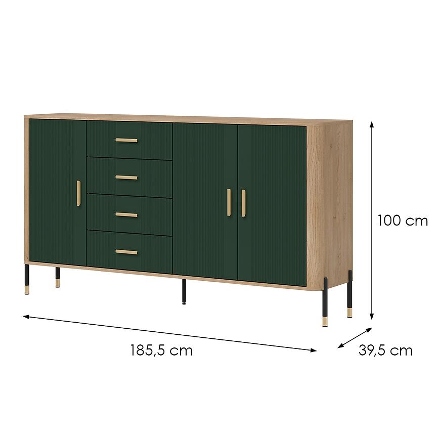 Komoda ma szerokość 185,5 cm, wysokość 100 cm oraz głębokość 39,5 cm, co zapewnia dużą przestrzeń do przechowywania. Model posiada trzy drzwi oraz cztery lub więcej szuflad, umożliwiając wygodne przechowywanie tekstyliów, dokumentów, dekoracji i innych przedmiotów, zachowując estetyczny wygląd bryły.