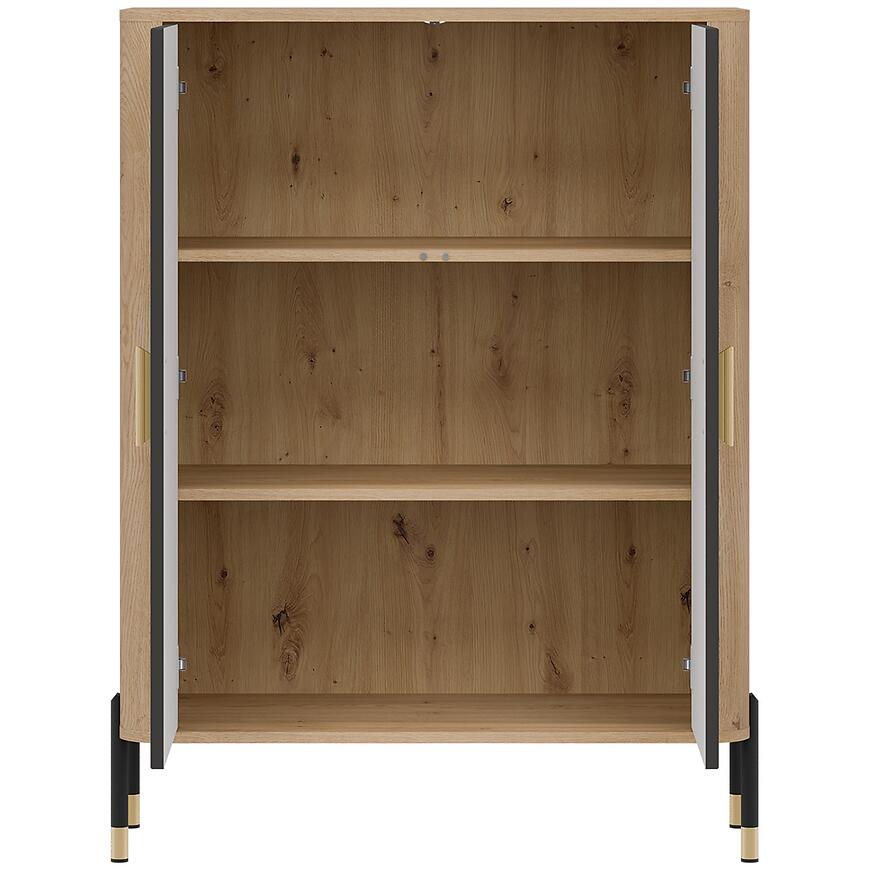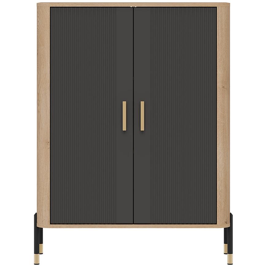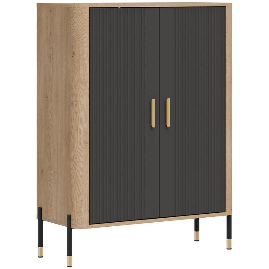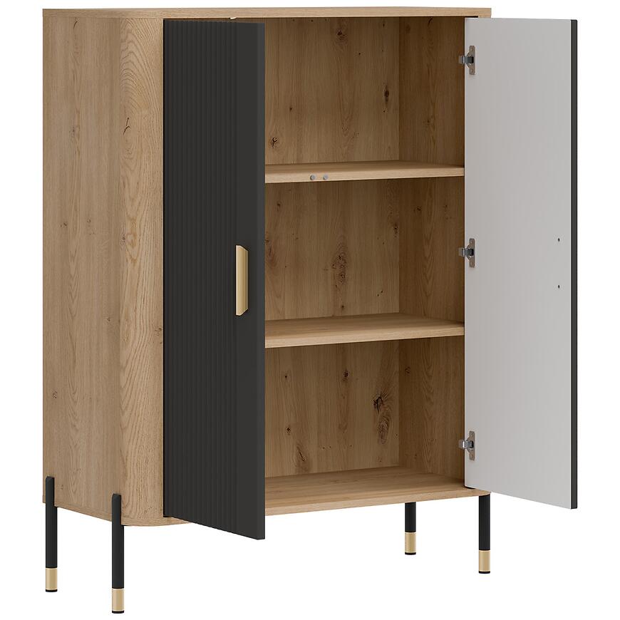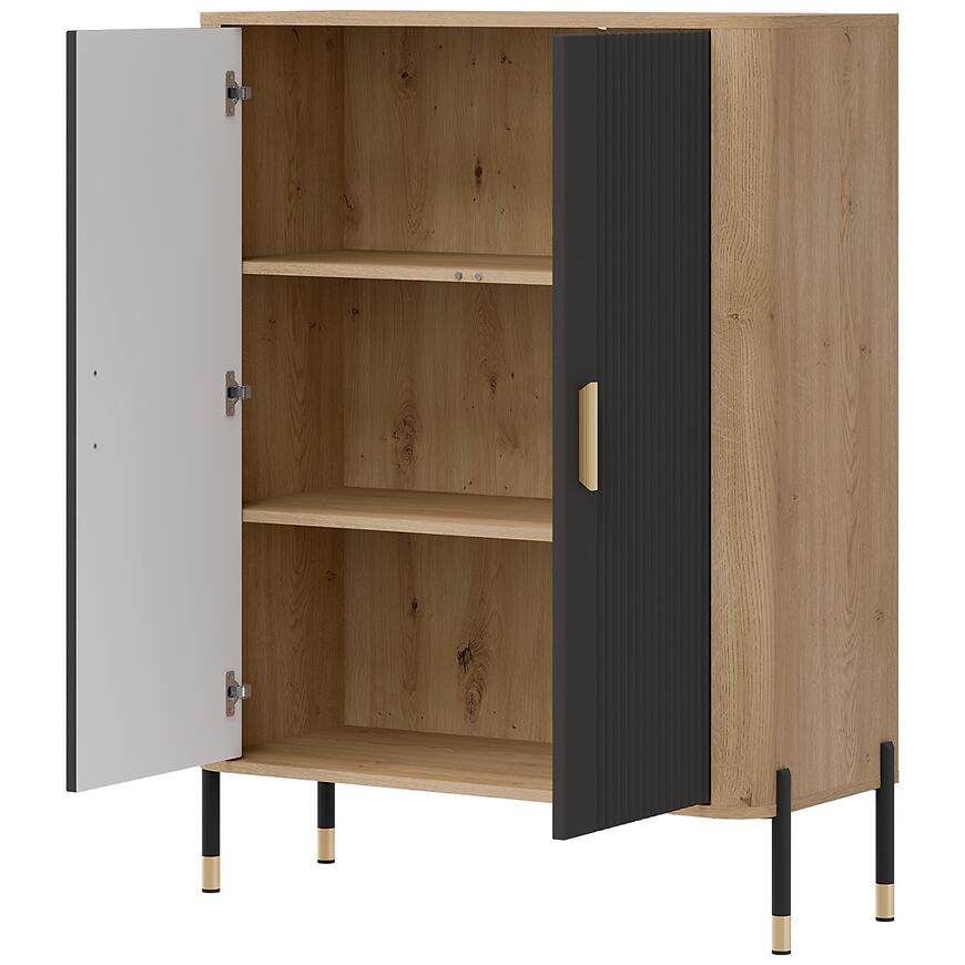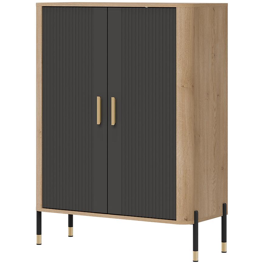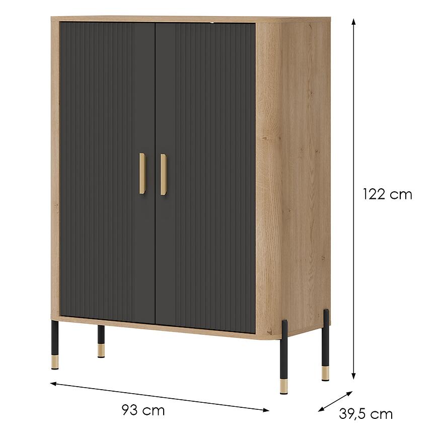 Komoda ma szerokość 93 cm, wysokość 122 cm oraz głębokość 39,5 cm, co sprawia, że zapewnia dużą przestrzeń do przechowywania przy zachowaniu kompaktowych wymiarów. Dwudrzwiowa konstrukcja umożliwia wygodne rozmieszczenie przedmiotów codziennego użytku, dokumentów czy elementów dekoracyjnych. Brak szuflad podkreśla minimalistyczną formę bryły i wpływa na jej nowoczesny charakter.