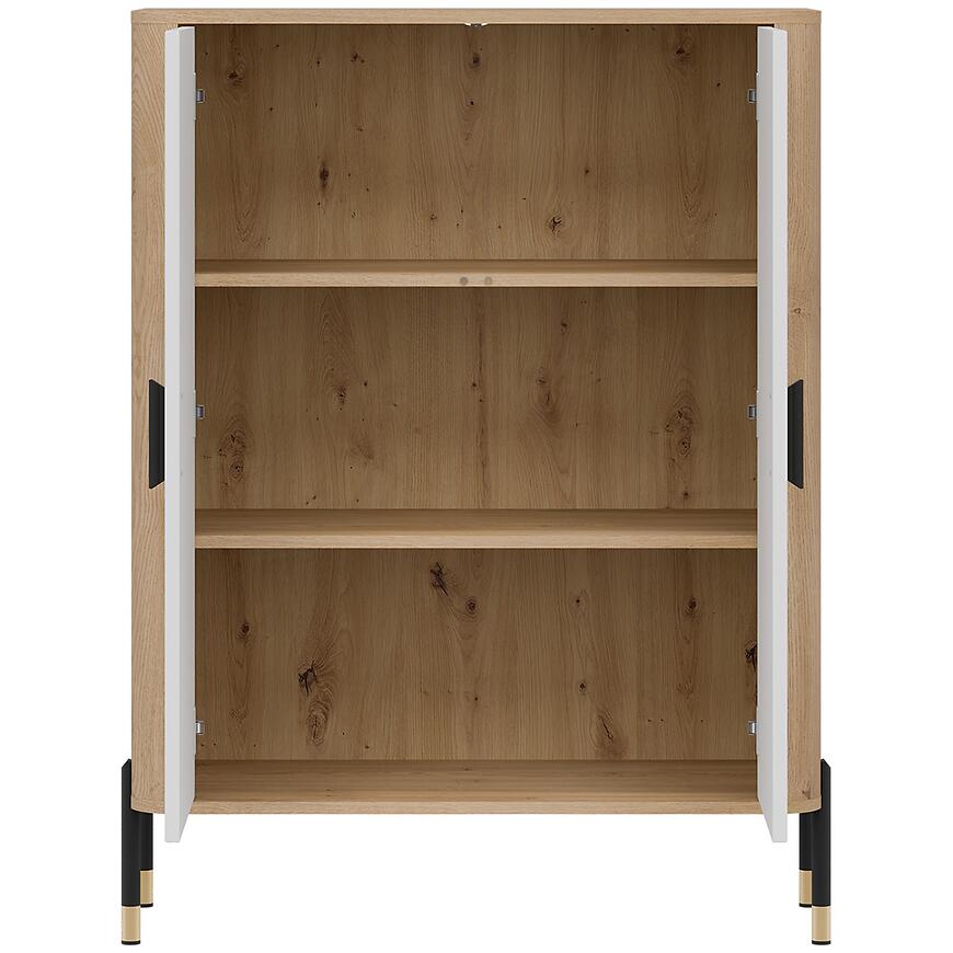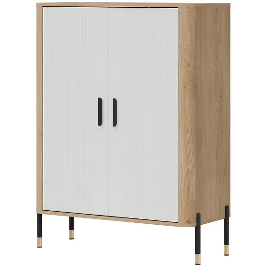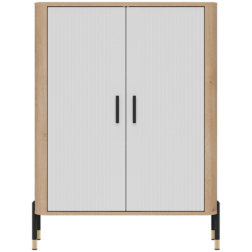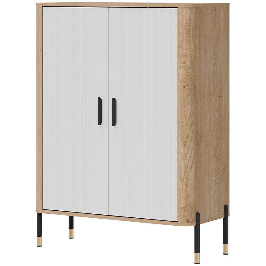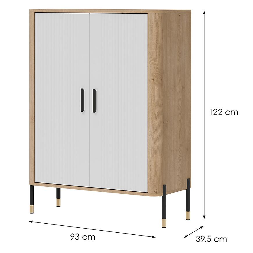 Szerokość komody wynosi 93 cm, wysokość 122 cm, a głębokość 39,5 cm, co zapewnia optymalne proporcje oraz dużą pojemność przy zachowaniu zgrabnej formy. Dwudrzwiowa konstrukcja umożliwia wygodne przechowywanie zastawy, tekstyliów, dokumentów lub innych domowych akcesoriów. Brak szuflad podkreśla prostotę bryły i sprzyja spójności wizualnej całego mebla.