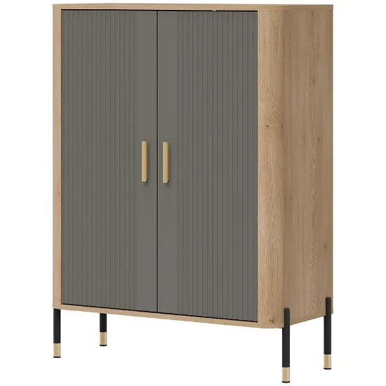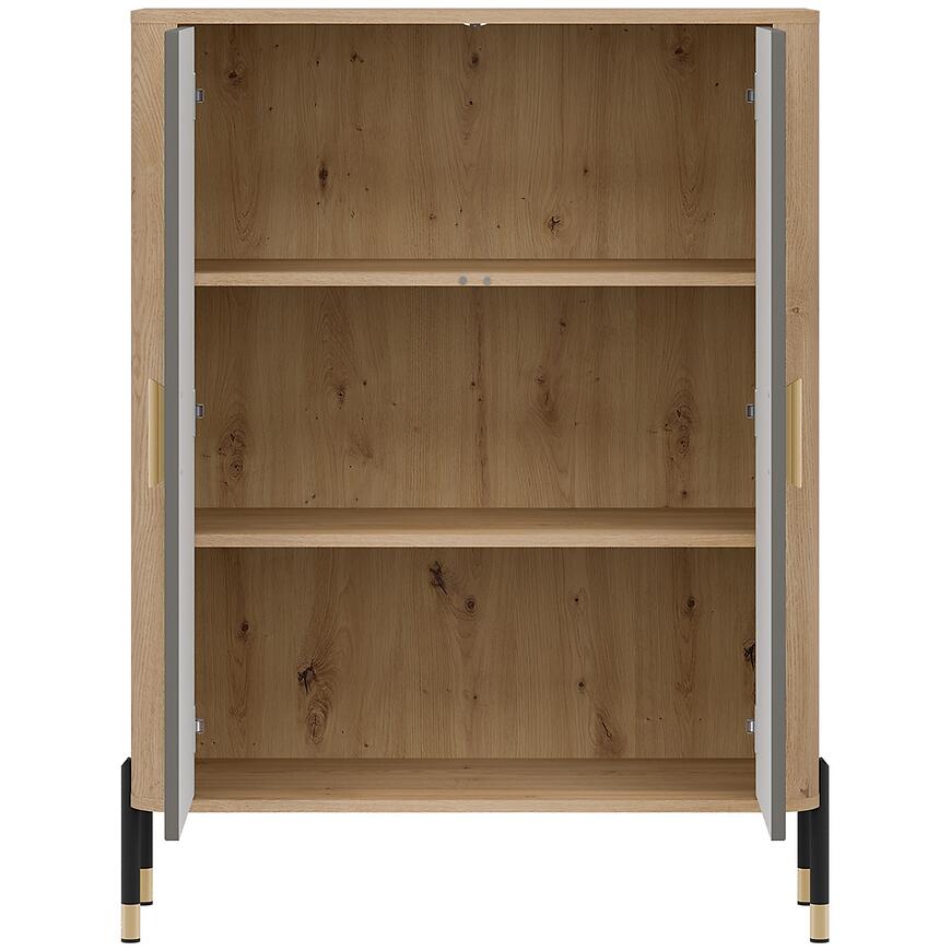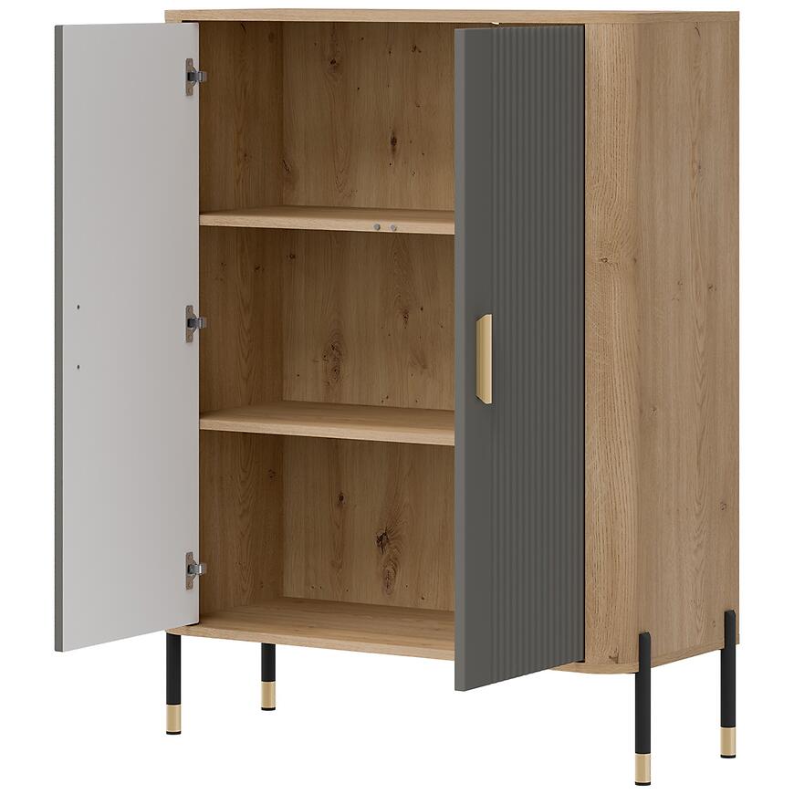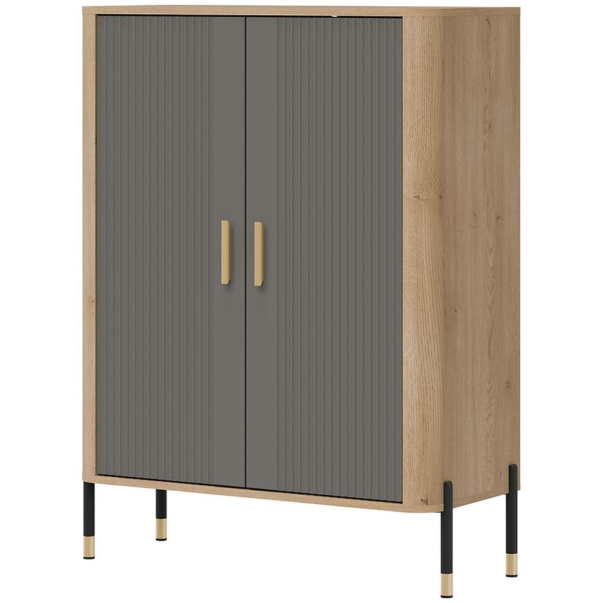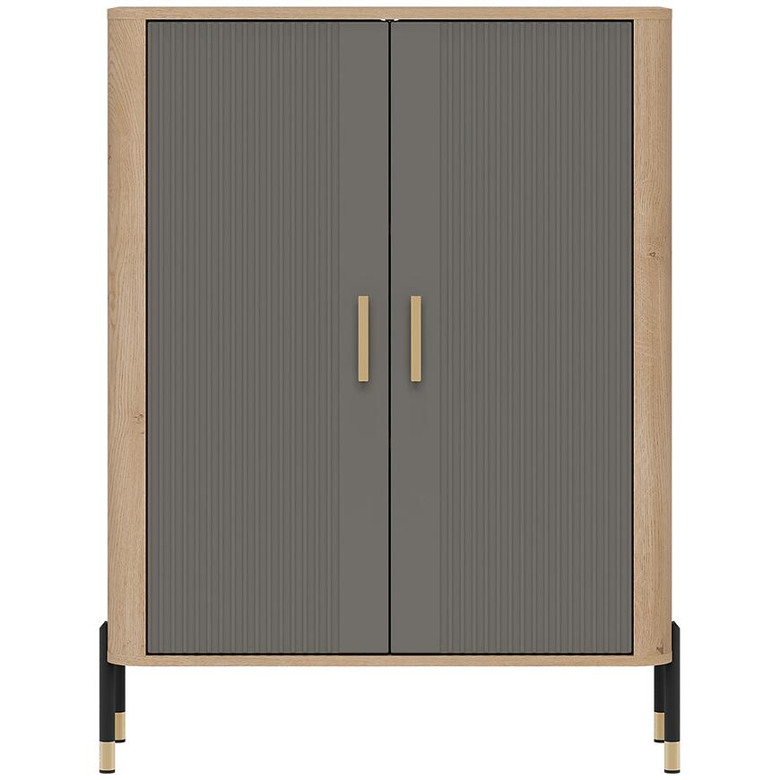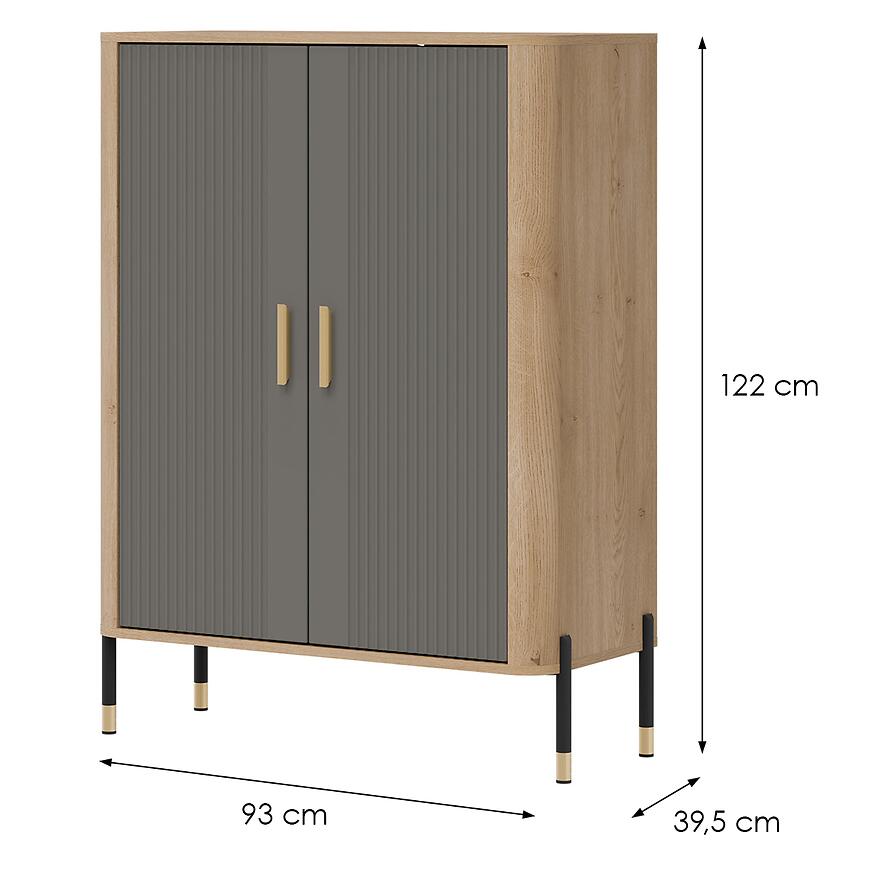 Komoda ma 93 cm szerokości, 122 cm wysokości oraz 39,5 cm głębokości, dzięki czemu oferuje wygodną przestrzeń do przechowywania przy zachowaniu proporcjonalnej, lekkiej wizualnie bryły. Dwudrzwiowa konstrukcja umożliwia przechowywanie naczyń, dokumentów, tekstyliów lub elementów dekoracyjnych. Brak szuflad podkreśla prostotę formy i pozwala zachować jednolity wygląd frontów.