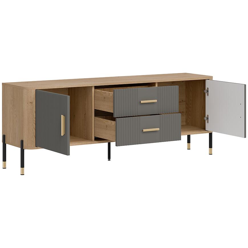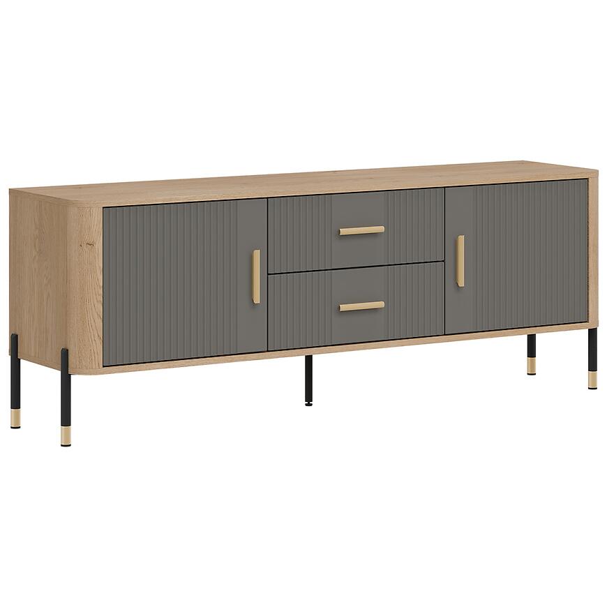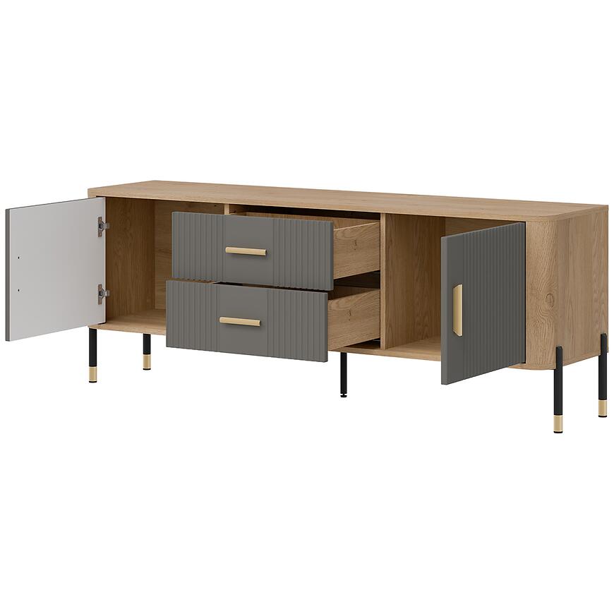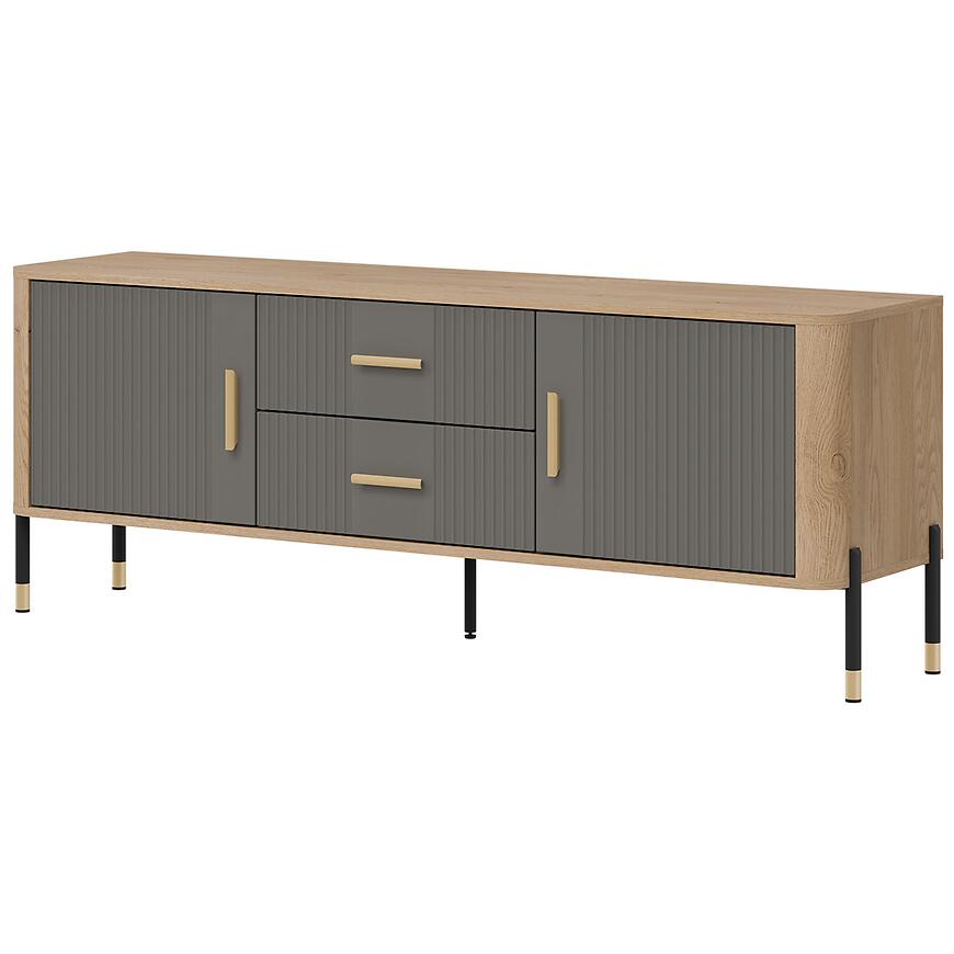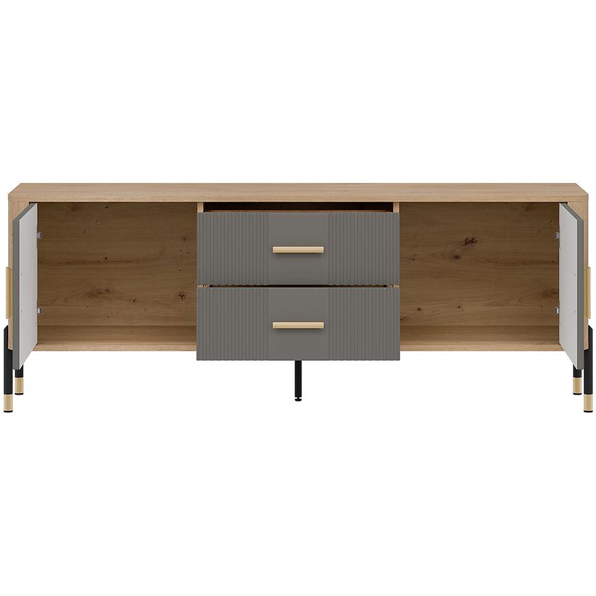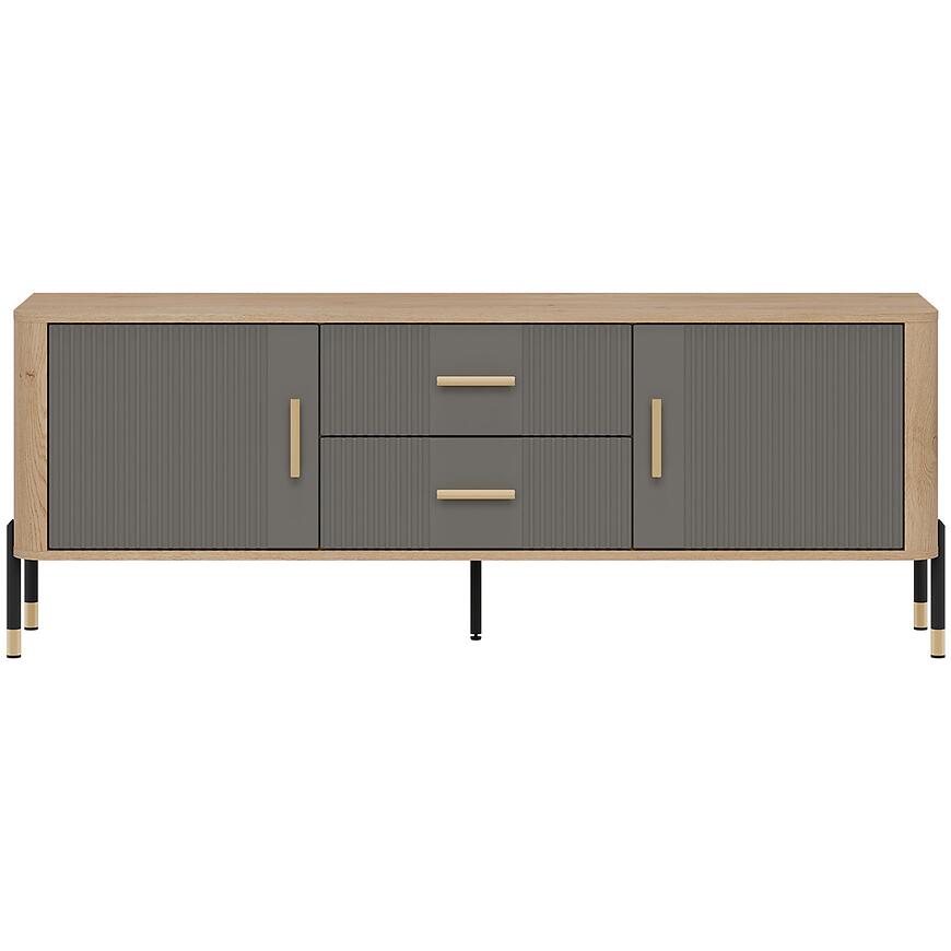 Fronty wykonane z płyty MDF charakteryzują się estetycznym wyglądem i odpornością na codzienne użytkowanie. Korpus z laminowanej płyty wiórowej zapewnia stabilność konstrukcji oraz łatwość w utrzymaniu czystości. Dwudrzwiowa komoda RTV została uzupełniona o dwie praktyczne szuflady, które umożliwiają uporządkowanie pilotów, kabli, dokumentów czy akcesoriów multimedialnych.