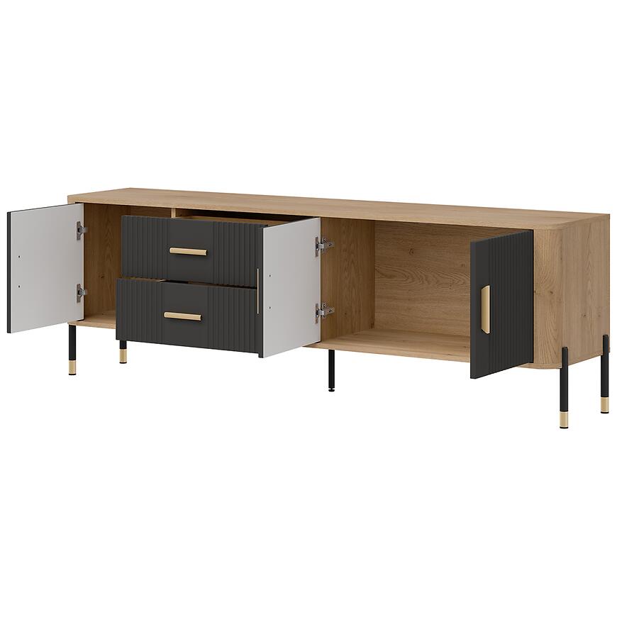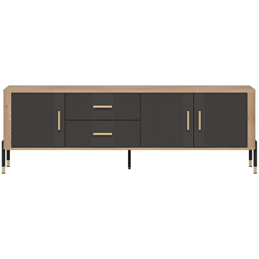 Komoda Dante RTV DT02 dąb cremona antracyt to nowoczesna szafka RTV, która łączy wyrazisty design z praktycznym układem przechowywania. Jest idealnym rozwiązaniem do salonu, tworząc funkcjonalną i estetyczną bazę pod telewizor oraz sprzęt multimedialny.