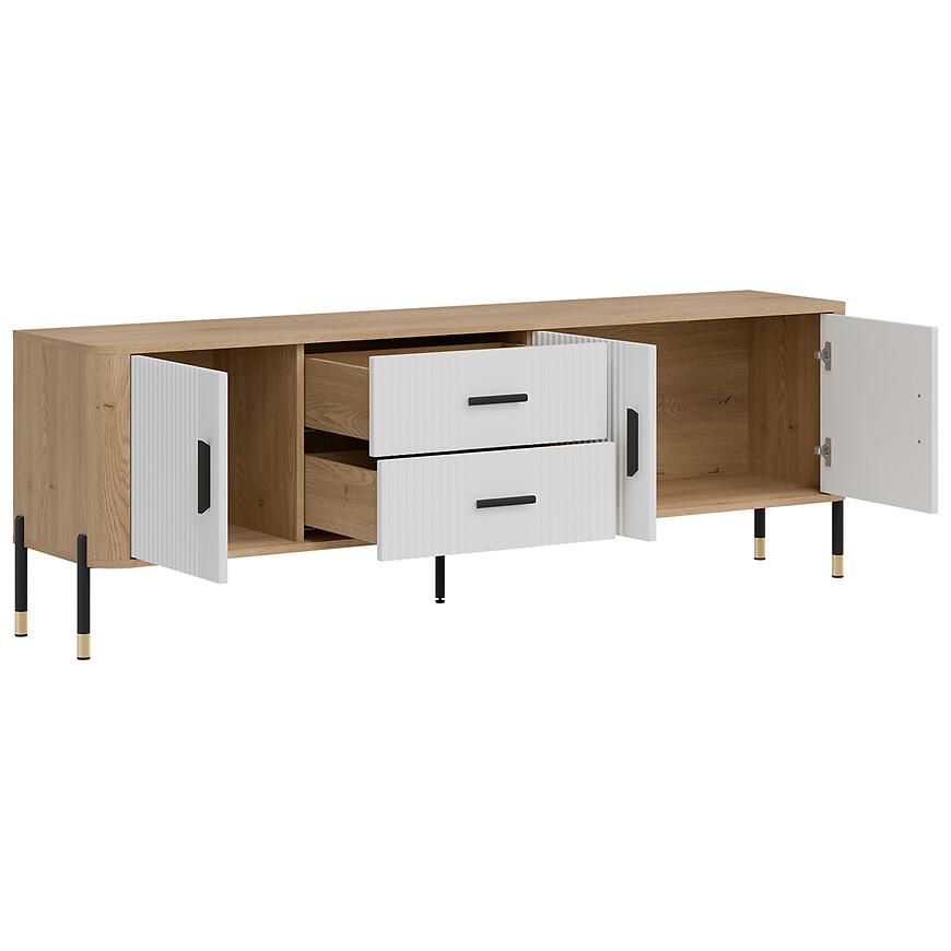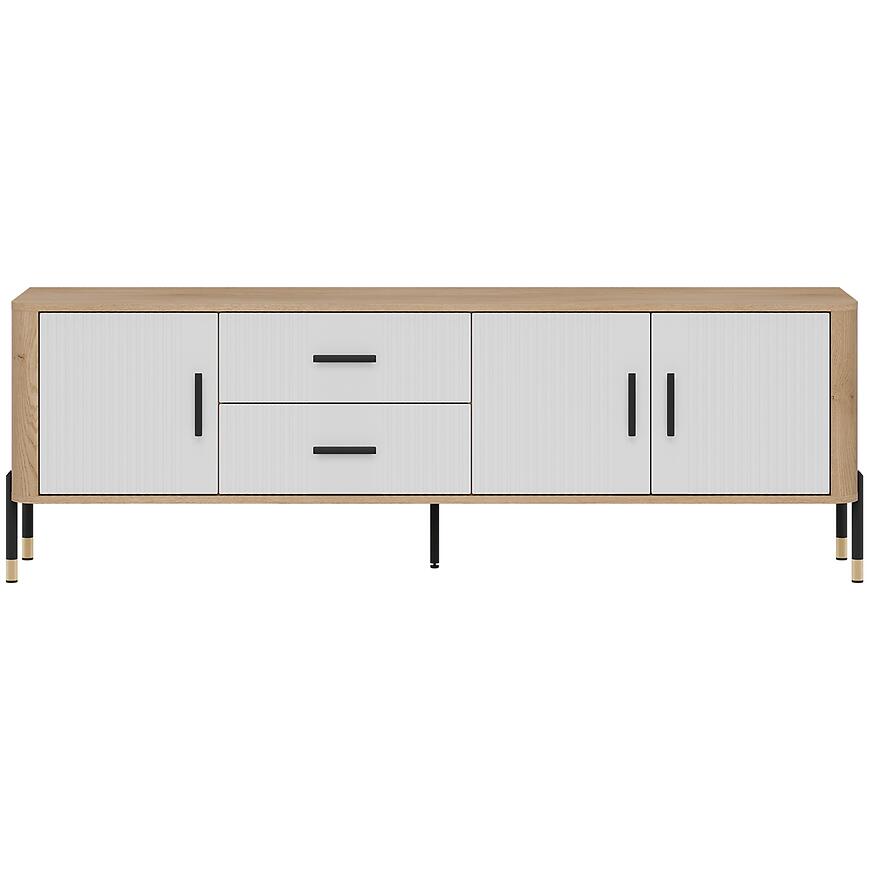 Fronty wykonano z płyty MDF, co zapewnia trwałość i estetyczny wygląd przez długie lata użytkowania. Korpus z laminowanej płyty wiórowej gwarantuje stabilną konstrukcję oraz odporność na codzienne użytkowanie. Dwudrzwiowa szafka z dwiema pojemnymi szufladami pozwala na wygodne przechowywanie akcesoriów RTV, dokumentów czy drobnych przedmiotów, ułatwiając utrzymanie porządku w strefie multimedialnej.