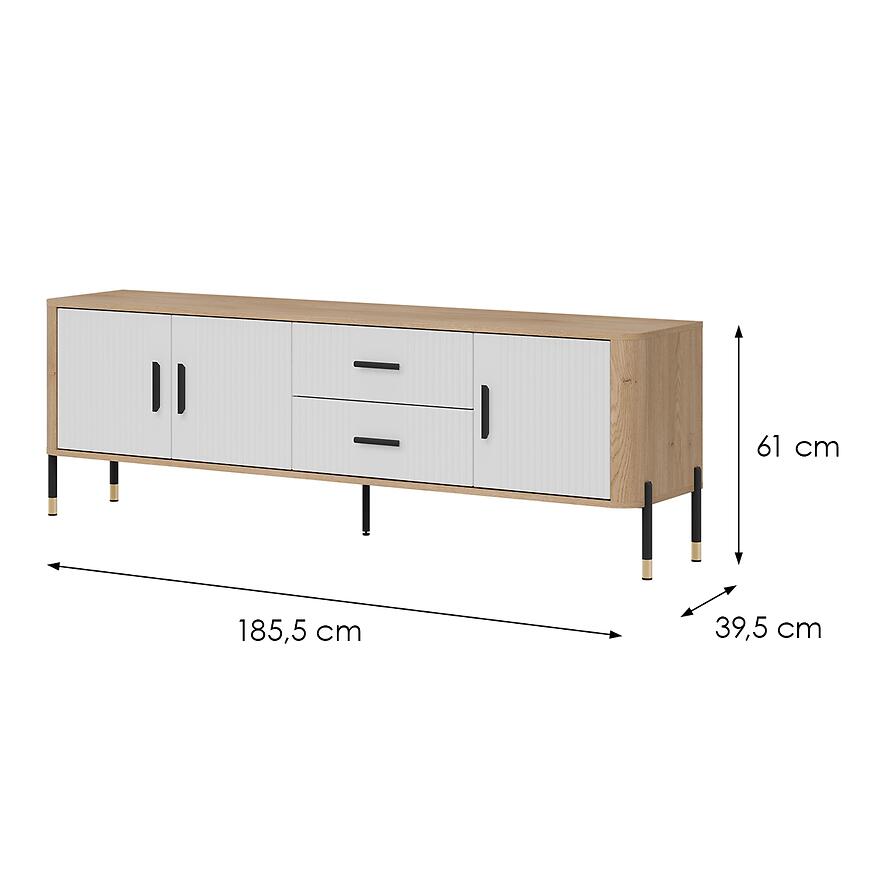 Komoda ma wysokość 61 cm, szerokość 185,5 cm oraz głębokość 39,5 cm. Mebel waży 42 kg, co świadczy o jego solidnym, a jednocześnie lekkim wykonaniu. Szafka RTV nie posiada oświetlenia, co pozwala zachować prostą, elegancką bryłę. Produkt przeznaczony jest do samodzielnego montażu, a jego konstrukcja została zaprojektowana z myślą o szybkim i intuicyjnym składaniu.