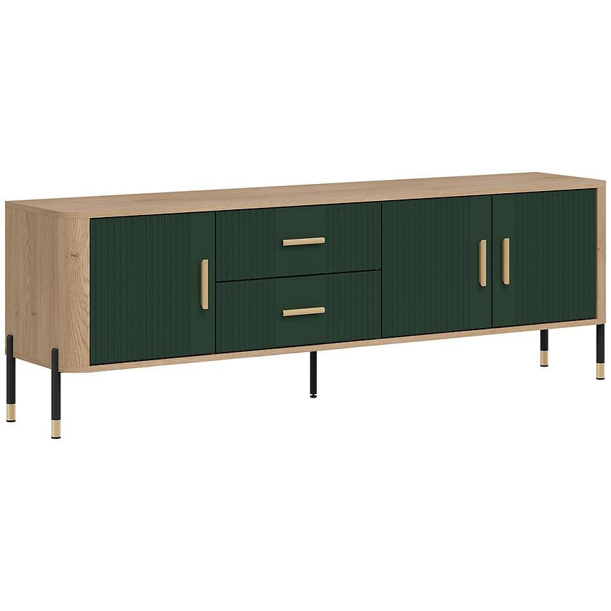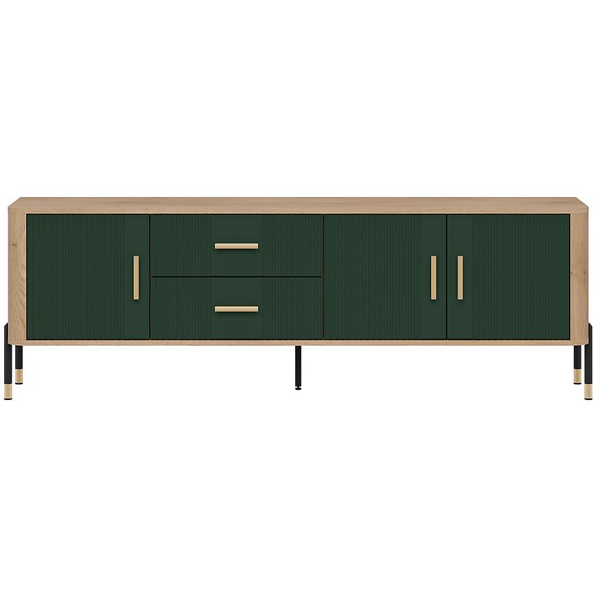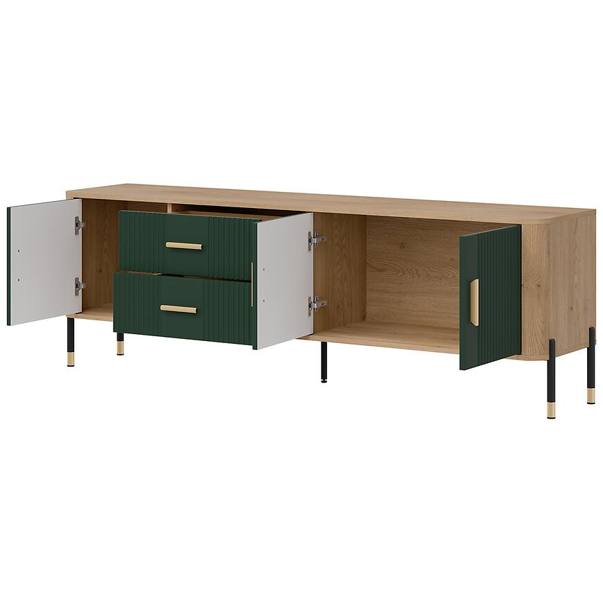 Komoda Dante RTV DT02 dąb cremona zielony to nowoczesna szafka RTV, która łączy wyrazisty akcent kolorystyczny z praktycznym układem przechowywania. Stanowi funkcjonalną i estetyczną bazę pod telewizor, uzupełniając współczesny salon i tworząc uporządkowaną strefę multimedialną.