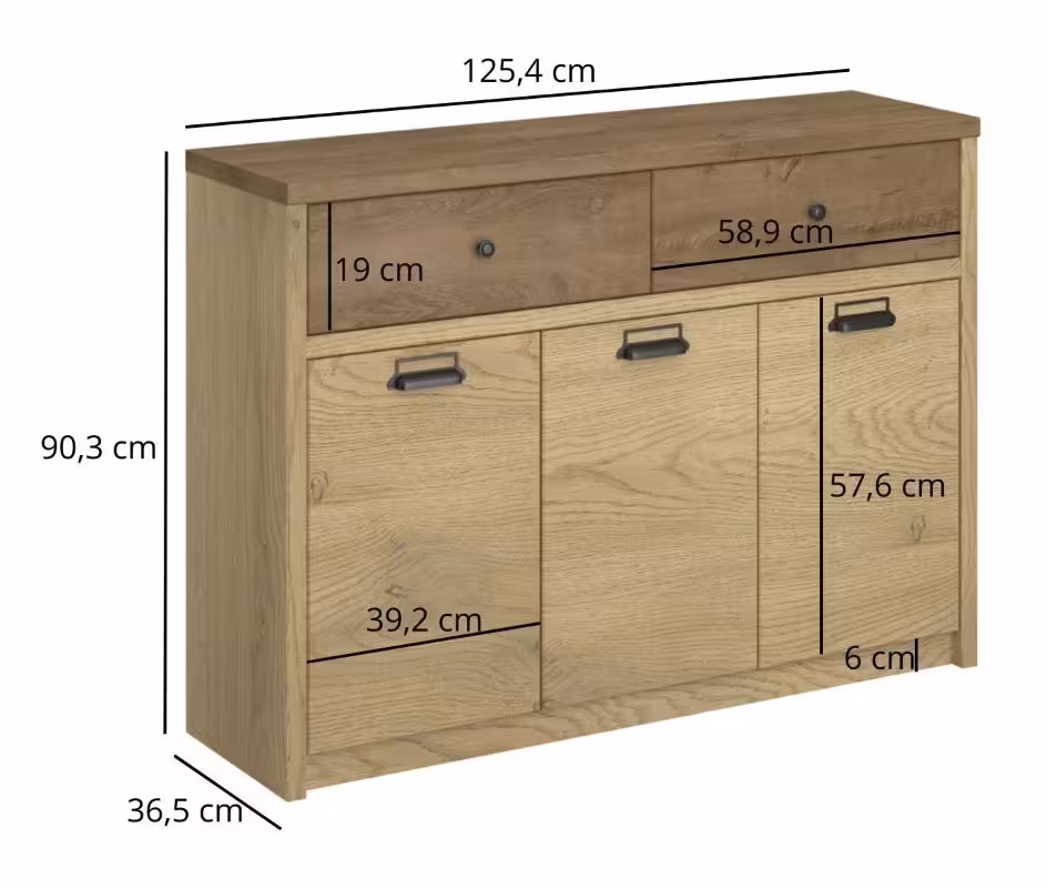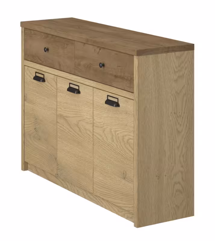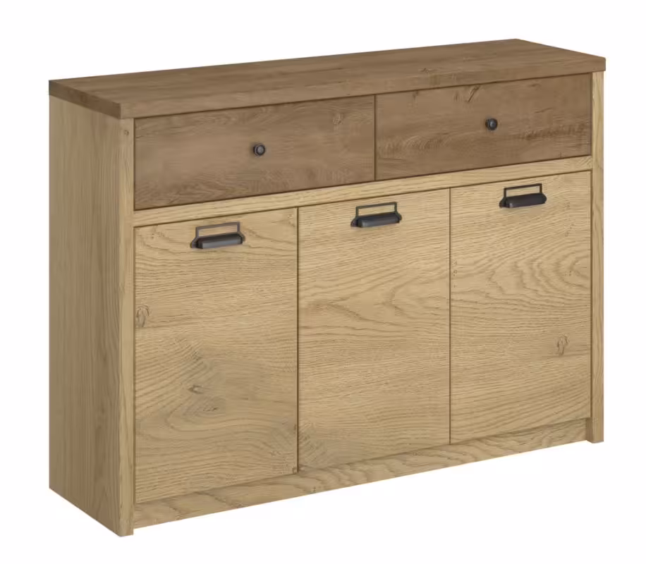 Komoda Denzel 3D2S łączy dwie formy przechowywania – zamykane szafki oraz szuflady, co pozwala lepiej dopasować sposób organizacji do różnych przedmiotów. To rozwiązanie sprawdza się tam, gdzie potrzebna jest zarówno przestrzeń na większe rzeczy, jak i miejsce na drobniejsze elementy, które warto mieć pod ręką.