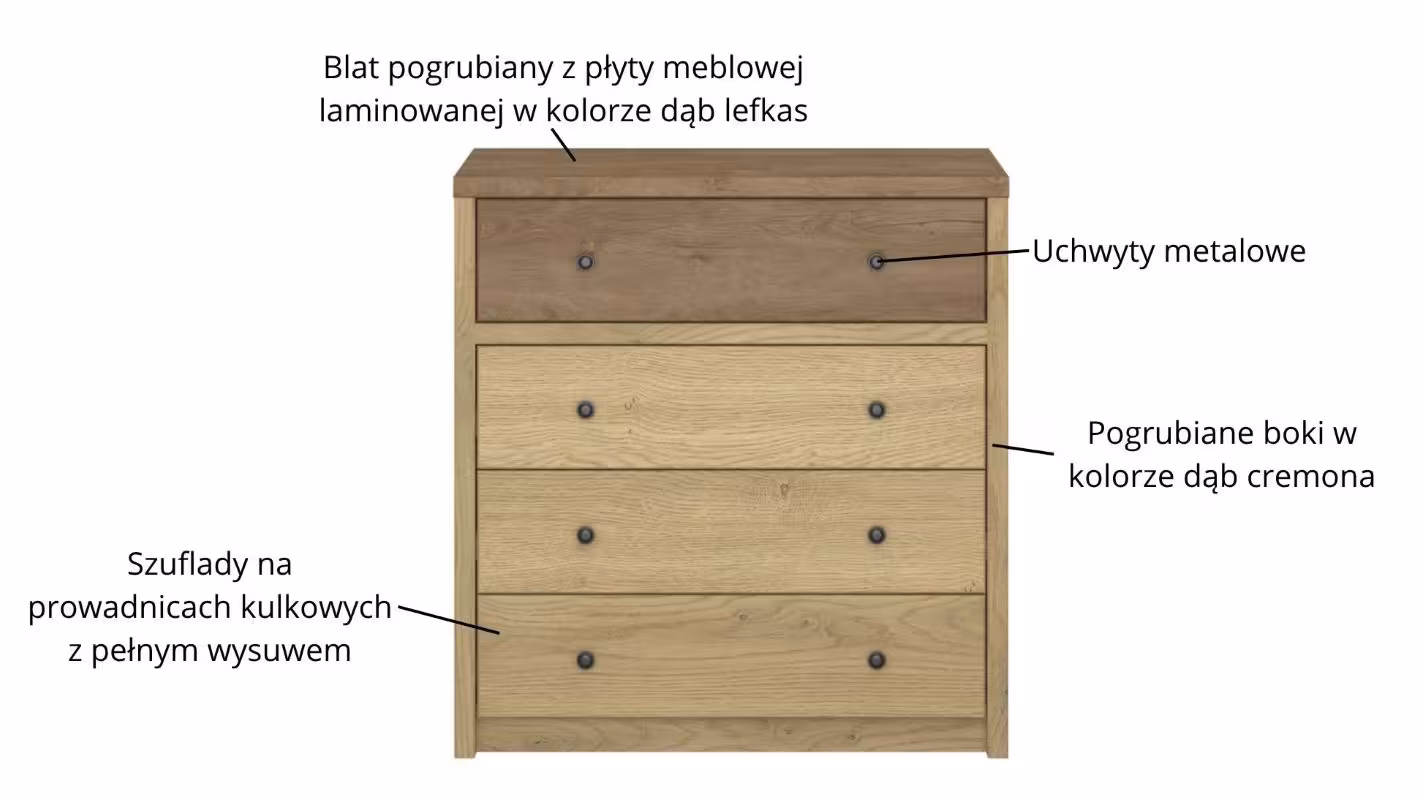 Korpus komody oparty na pogrubianych bokach w kolorze dąb cremona wprowadza jaśniejszy ton, który równoważy wyrazisty blat w dekorze dąb lefkas. Takie zestawienie sprawia, że mebel dobrze prezentuje się zarówno w jasnych, jak i ciemniejszych aranżacjach.