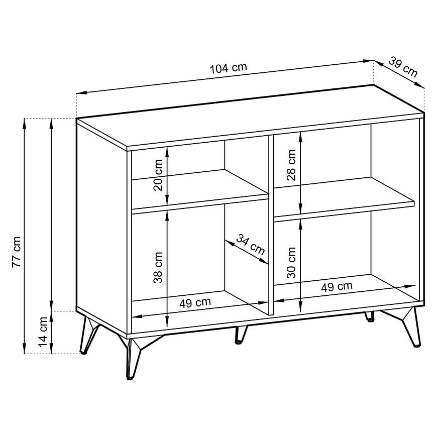 Szerokość komody wynosi104 cm, wysokość 77 cm i głębokość 39 cm, co czyni ją idealnym rozwiązaniem do przechowywania różnych przedmiotów, bez zajmowania zbyt dużo przestrzeni w pomieszczeniu.