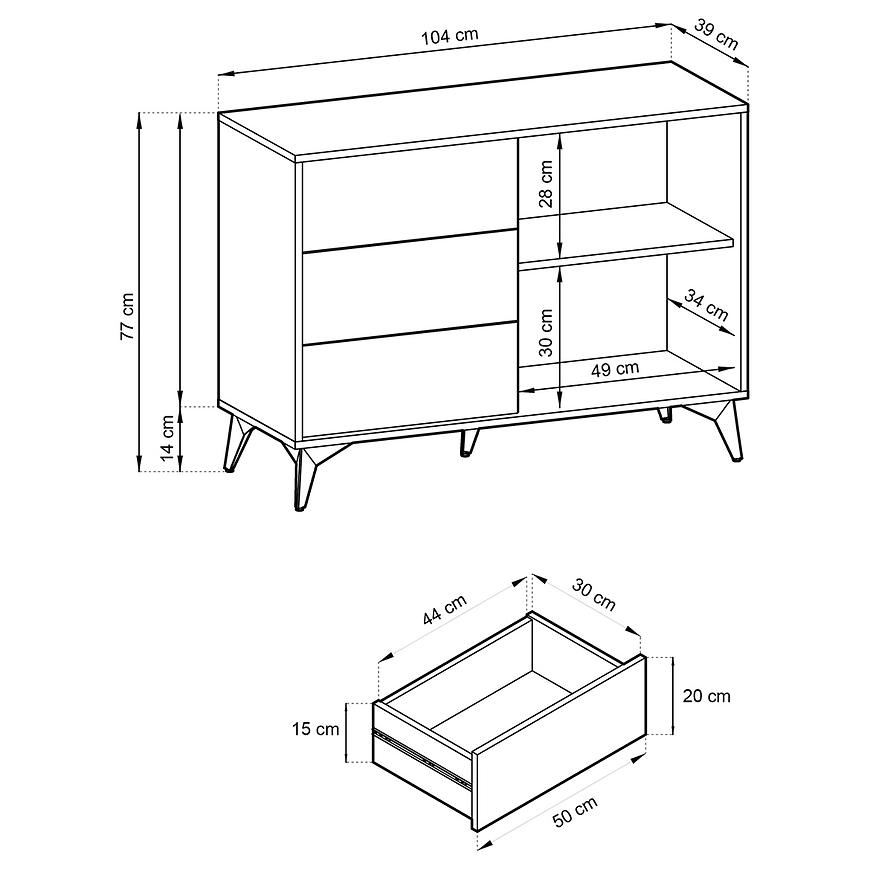Meble z kolekcji Diamond są wyjątkowe pod wieloma względami. Komoda o wymiarach 104 cm szerokości, 77 cm wysokosci i 39 cm głębokości doskonale wpisze się w rożnego rodzaju przestrzenie. Dwie zamykane szafki pozwalają na wygodne przechowywanie różnorodnych rzeczy, a wnętrze komody jest przestronne i funkcjonalne.