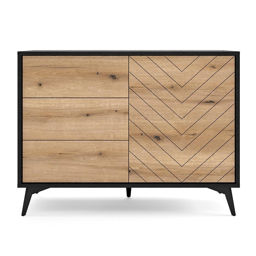 Komoda jest wykonana z trwałej płyty wiórowej laminowanej, co gwarantuje jej solidność i wytrzymałość. Fronty komody mają dekor dębu evoke, który nadaje im naturalnego uroku, podczas gdy czarny korpus komody dodaje kontrastu i stylu. Zarówno fronty, jak i korpus komody są wykończone matowym lakierem, co nadaje meblowi eleganckiego, stonowanego charakteru.