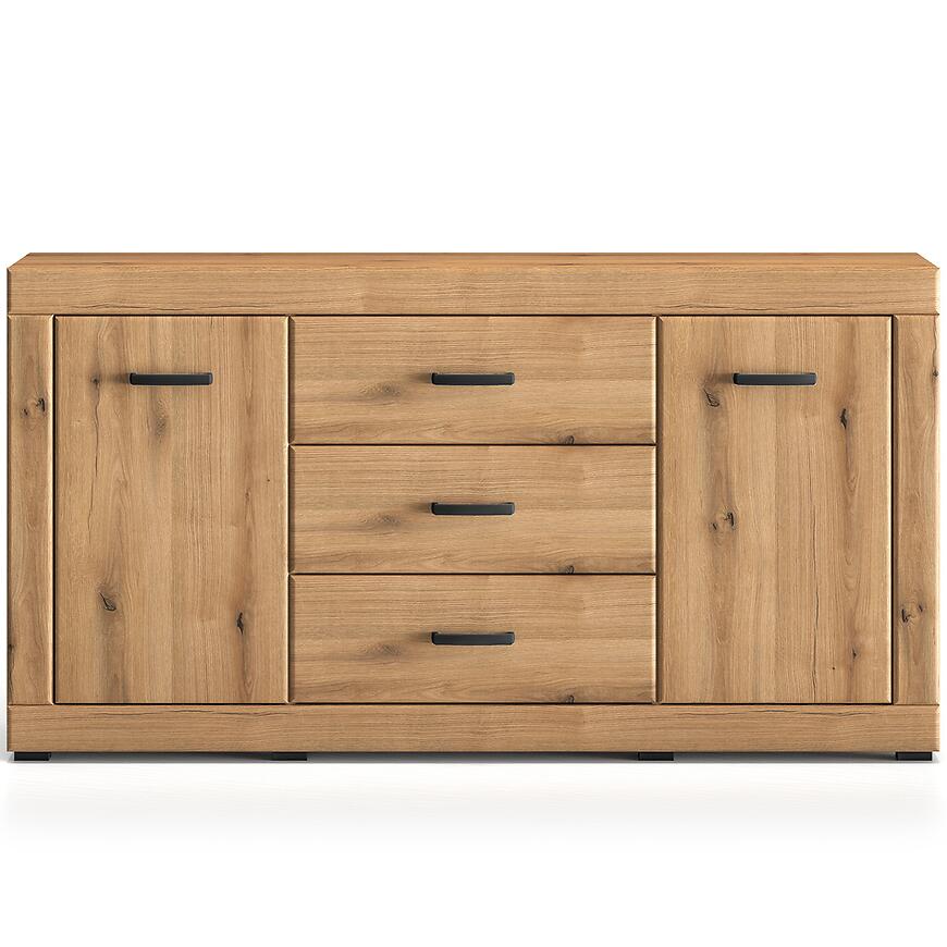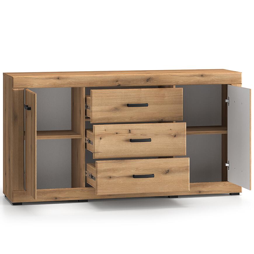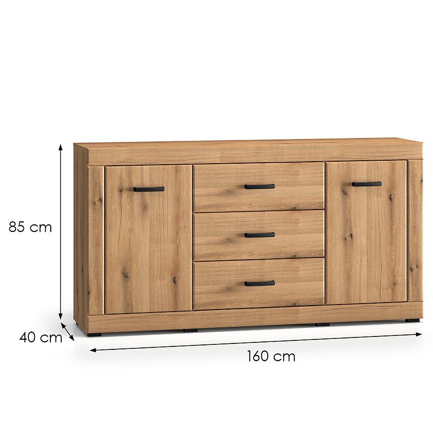Komoda posiada 3 pojemne szuflady i dwudrzwiową konstrukcję, umożliwiającą wygodne przechowywanie różnych przedmiotów. Dzięki szerokości 160 cm i głębokości 40 cm, mebel oferuje dużą powierzchnię użytkową, zachowując przy tym kompaktowe wymiary, które pasują do wielu wnętrz. Wysokość 85 cm zapewnia komfortowy dostęp do zawartości.