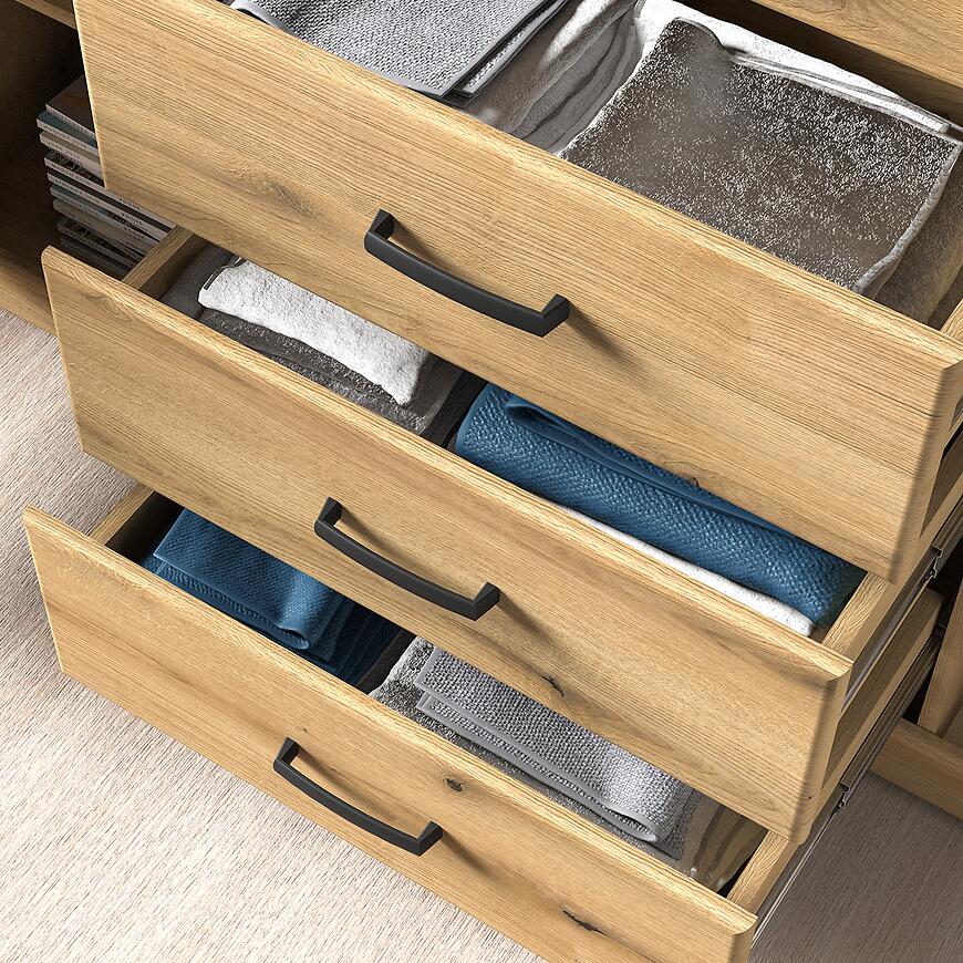 Fronty i korpus komody wykonano z płyty MDF i płyty wiórowej laminowanej, co gwarantuje odporność na uszkodzenia i stabilność przez lata. Jasne drewnopodobne wybarwienie w odcieniu dąb evoke podkreśla naturalny wygląd mebla, a matowe wykończenie dodaje subtelnej elegancji.