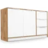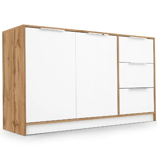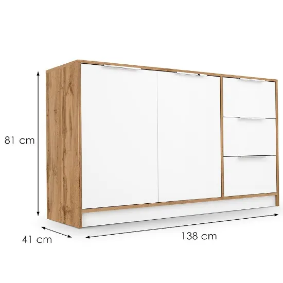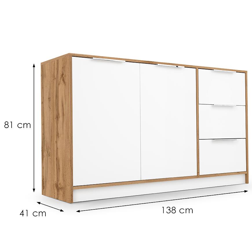 Komoda Duarte 2d3s Biały / Dąb Wotan to stylowe połączenie klasyki z nowoczesnością, które wnosi do wnętrza świeżość i ciepło. Kontrast czystej bieli z wyrazistym rysunkiem dębu Wotan tworzy harmonijną i elegancką kompozycję, idealną do jasnych, przytulnych przestrzeni.
