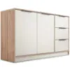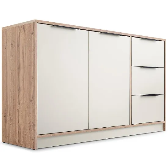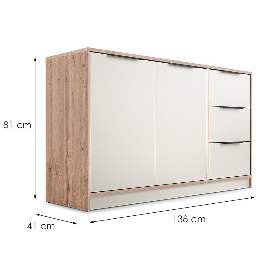 Komoda Duarte 2d3s Kaszmir / Dąb Wotan to elegancki mebel, który łączy nowoczesny styl z ciepłem naturalnych akcentów. Delikatny, matowy odcień kaszmiru w zestawieniu z wyrazistym dekorem dębu Wotan tworzy harmonijną i ponadczasową kompozycję, idealną do wnętrz urządzonych z klasą.