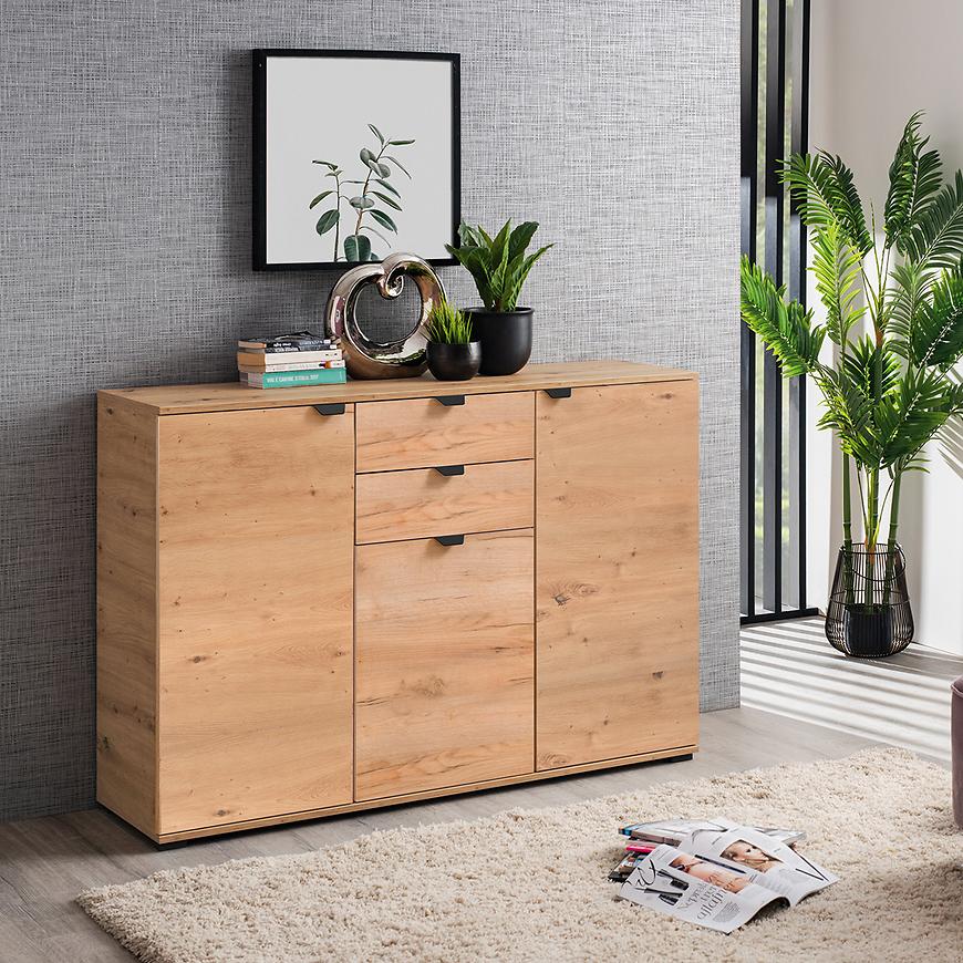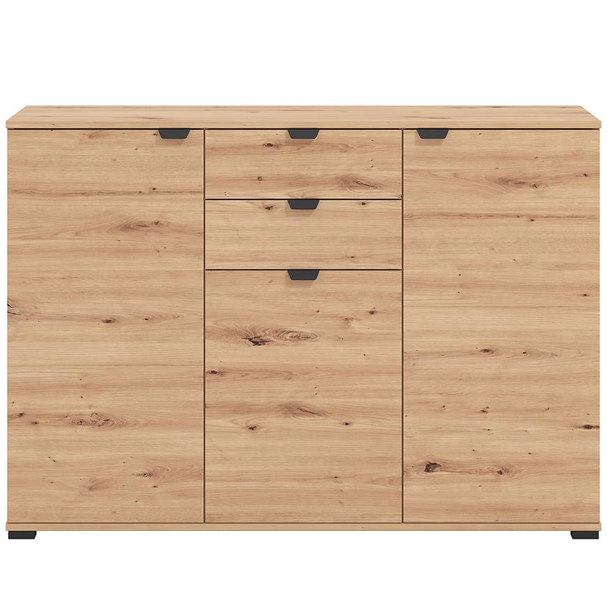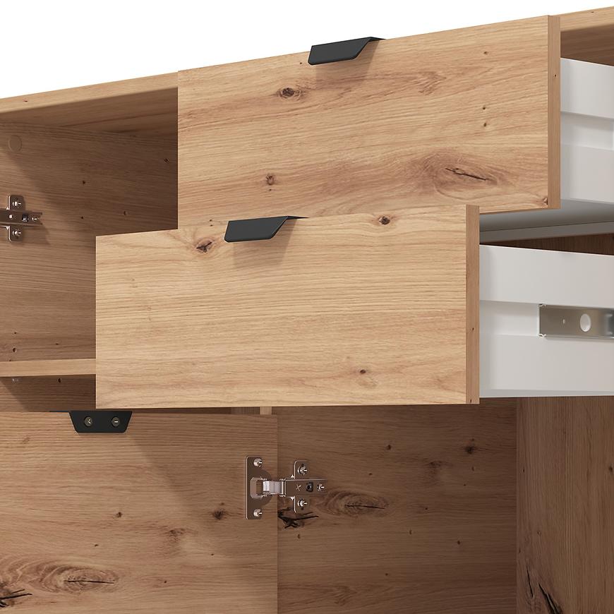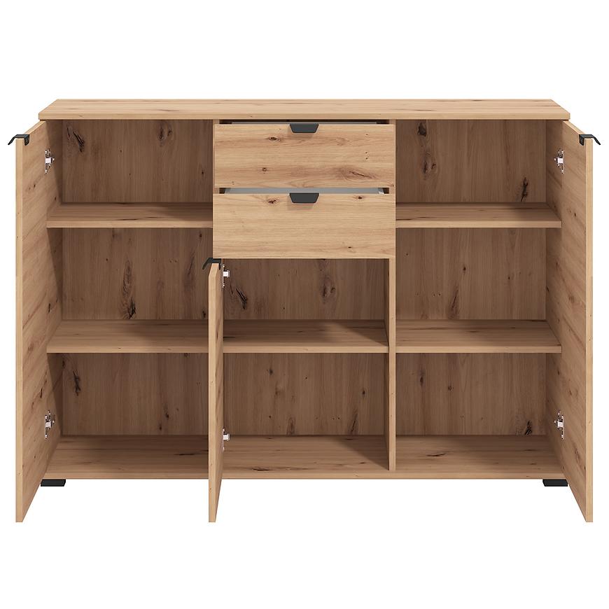 Komoda Duerto to elegancka i funkcjonalna meblościanka, idealna do nowoczesnych wnętrz. Jej trzydrzwiowy design z dwoma szufladami zapewnia dużo miejsca na przechowywanie. Fronty w kolorze artisan oraz matowe wykończenie nadają jej nowoczesny wygląd, który doskonale komponuje się z różnorodnymi aranżacjami wnętrz.