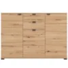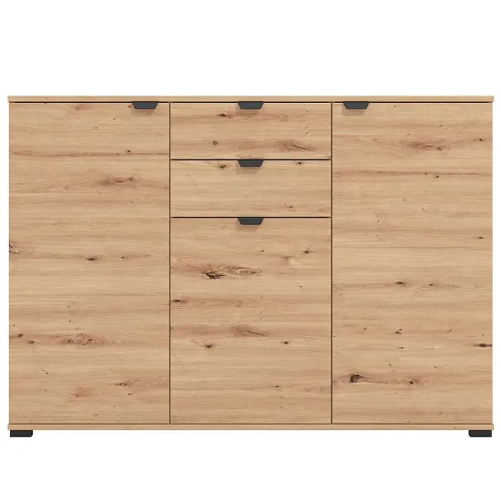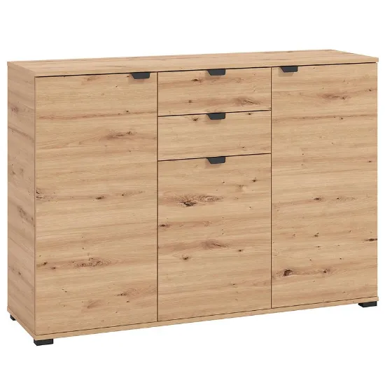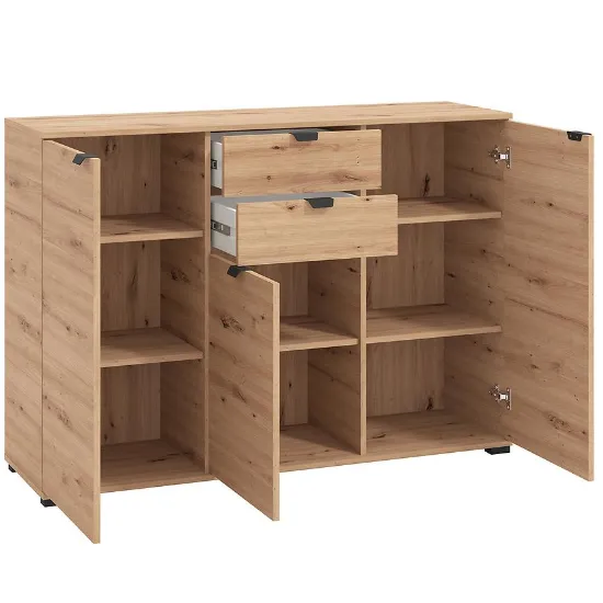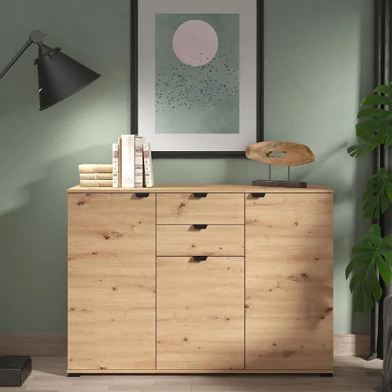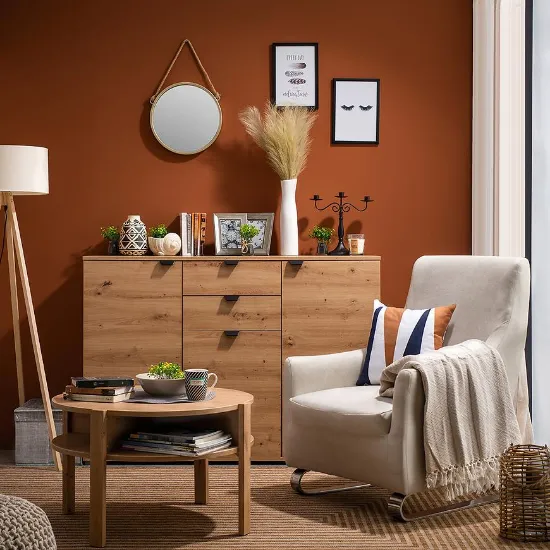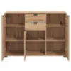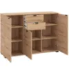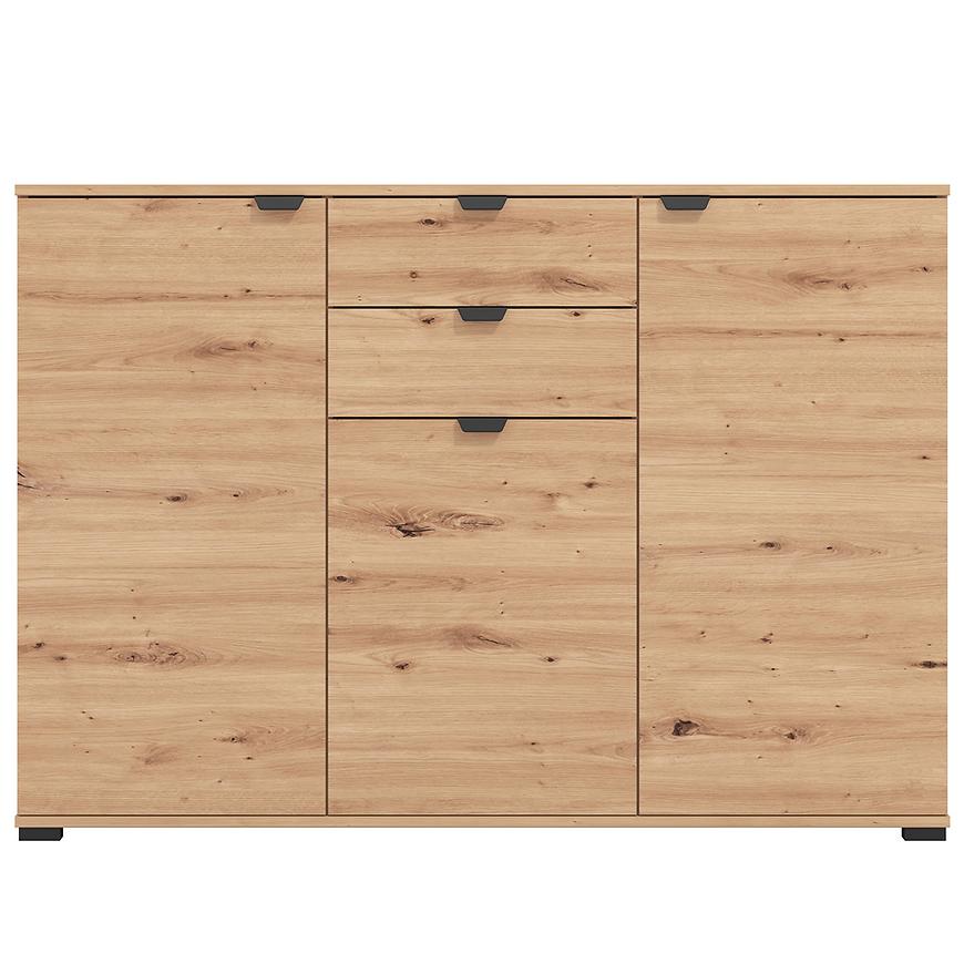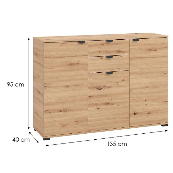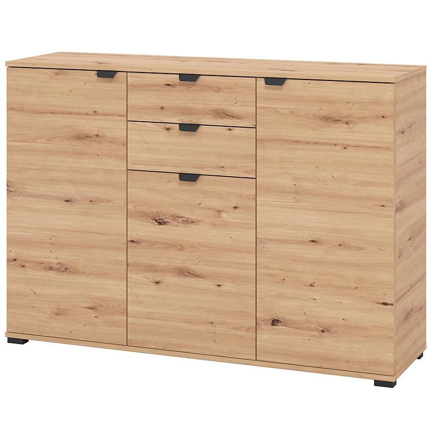 Komoda Duerto to elegancka i funkcjonalna meblościanka, idealna do nowoczesnych wnętrz. Jej trzydrzwiowy design z dwoma szufladami zapewnia dużo miejsca na przechowywanie. Fronty w kolorze artisan oraz matowe wykończenie nadają jej nowoczesny wygląd, który doskonale komponuje się z różnorodnymi aranżacjami wnętrz.