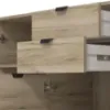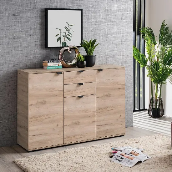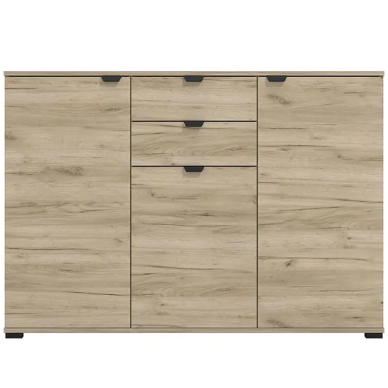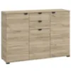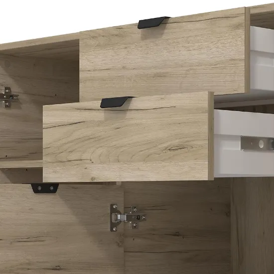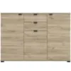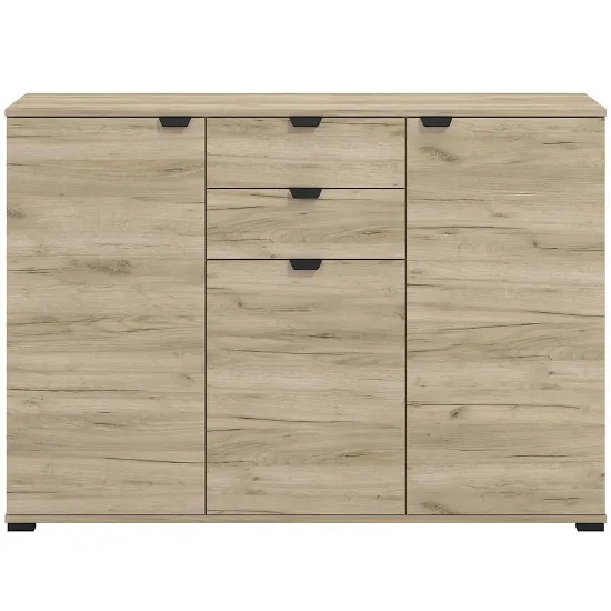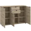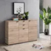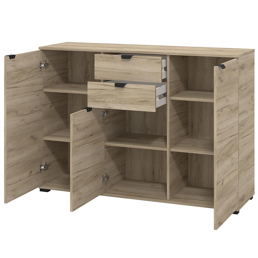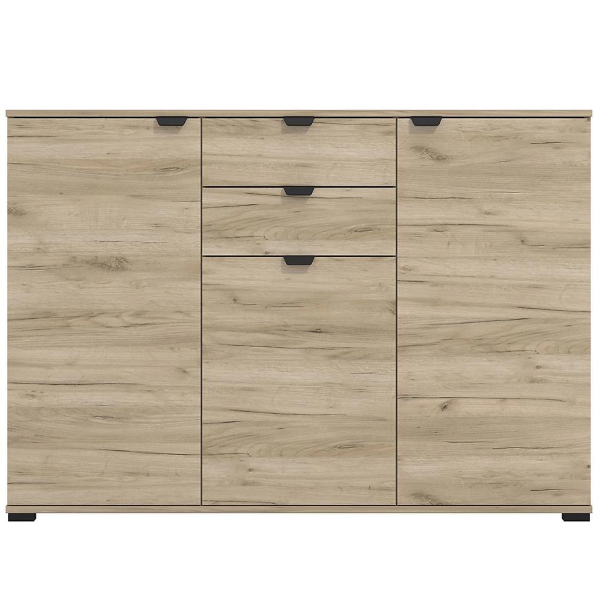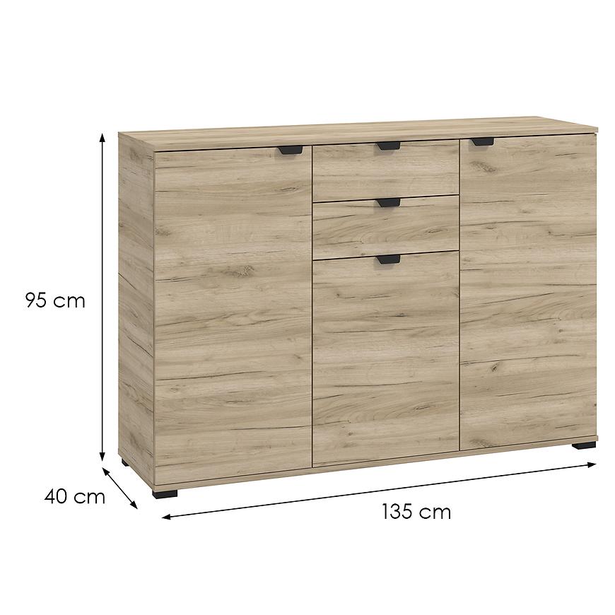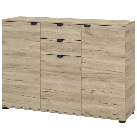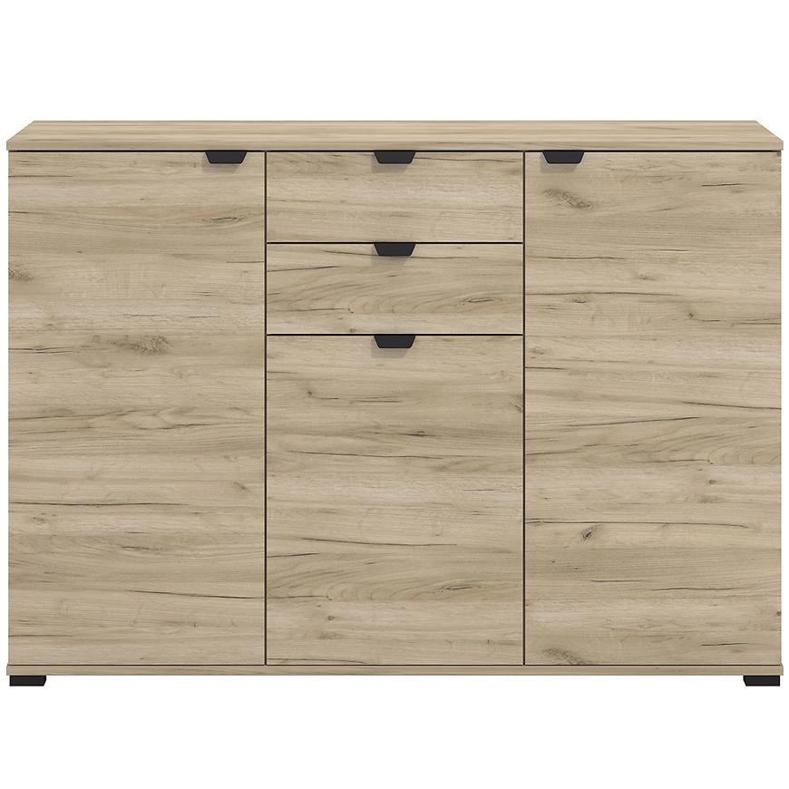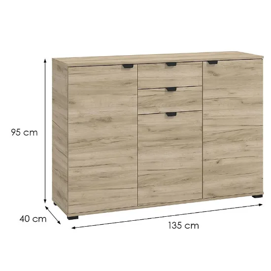 Komoda Duerto to elegancka i funkcjonalna meblościanka, idealna do nowoczesnych wnętrz. Jej trzydrzwiowy design z dwoma szufladami zapewnia dużo miejsca na przechowywanie. Fronty w kolorze szary dąb oraz matowe wykończenie nadają jej nowoczesny wygląd, który doskonale komponuje się z różnorodnymi aranżacjami wnętrz.