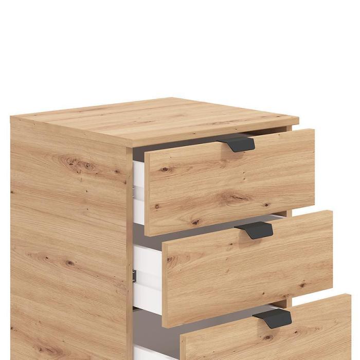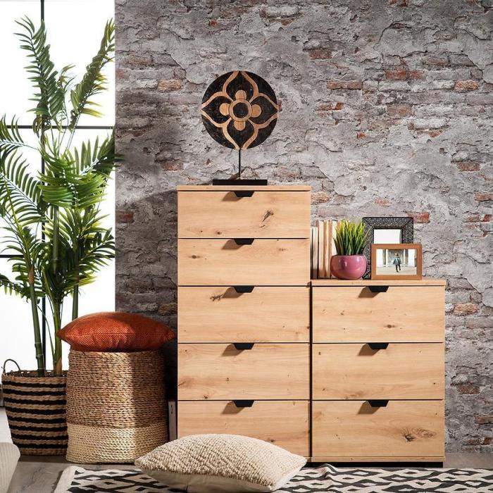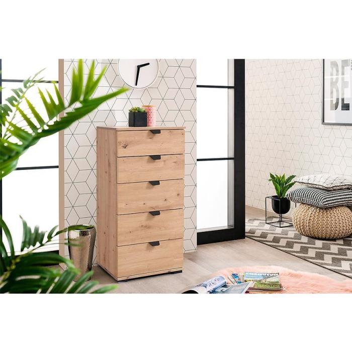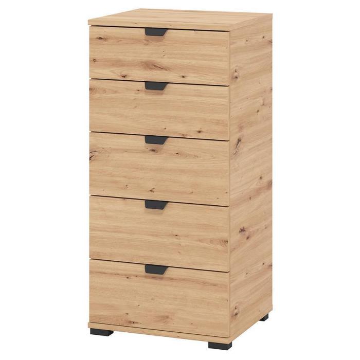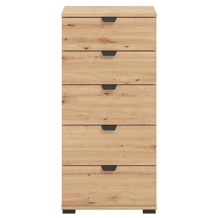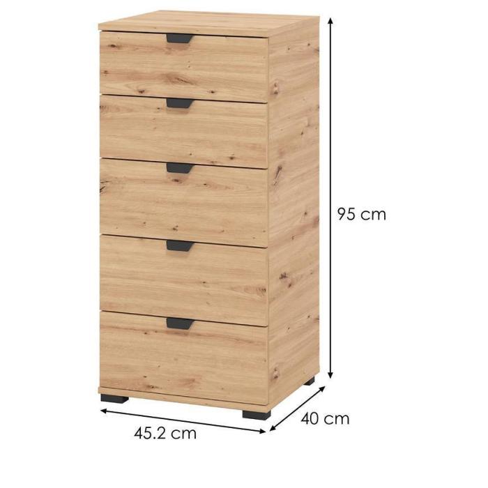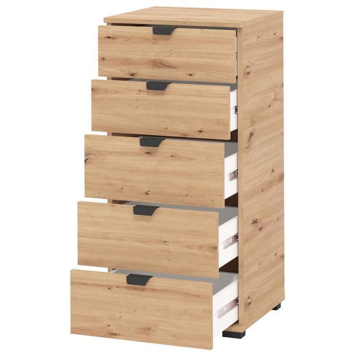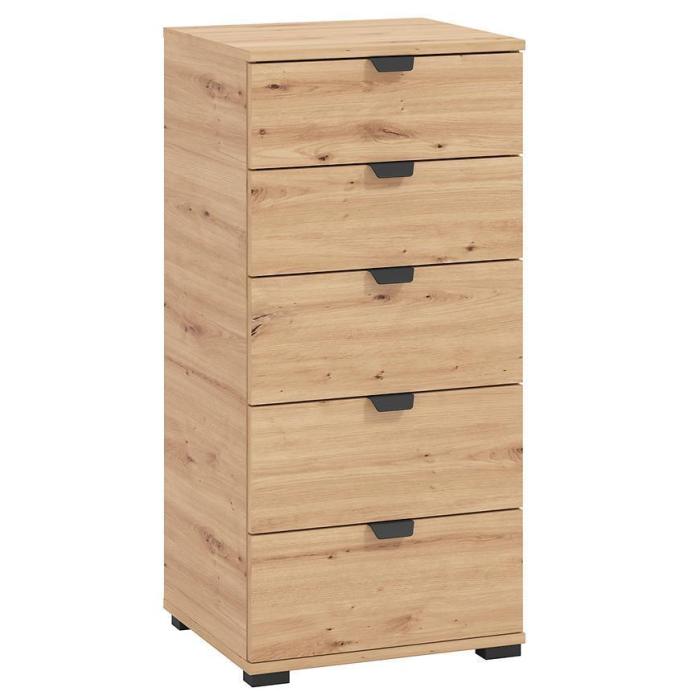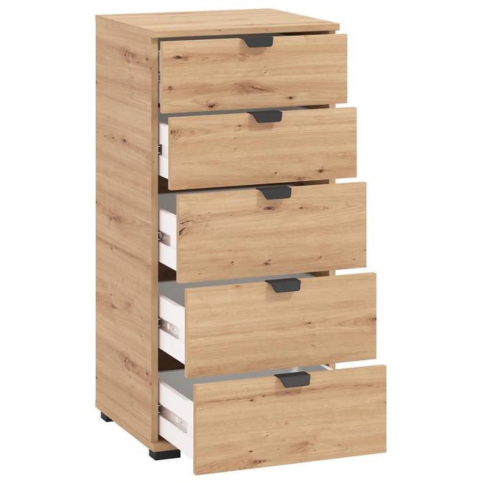 Komoda DUERTO to doskonała propozycja do sypialni lub do przedpokoju. Doskonale sprawdzi się również w pokoju dziennym. Posiada pięć pojemnych szuflad. Wykonana w płyty wiórowej laminowanej. Komoda oferuje funkcjonalne wnętrze, a ponadto wyróżnia się nowoczesnym stylem.