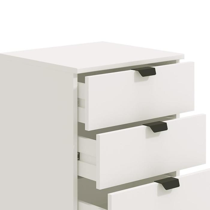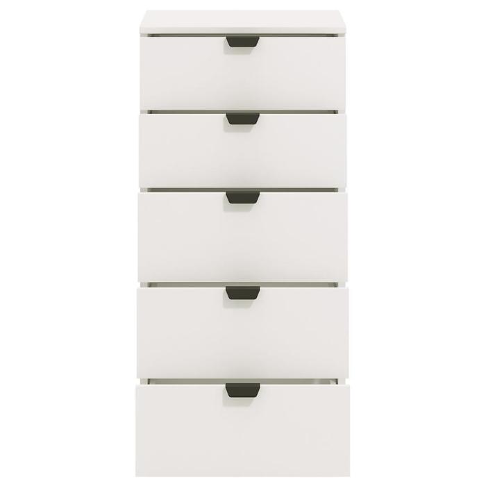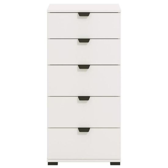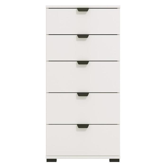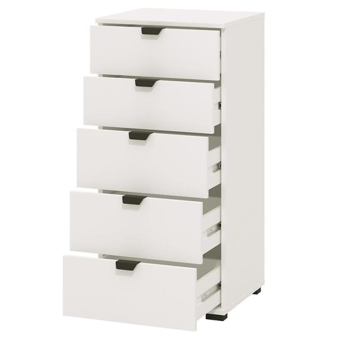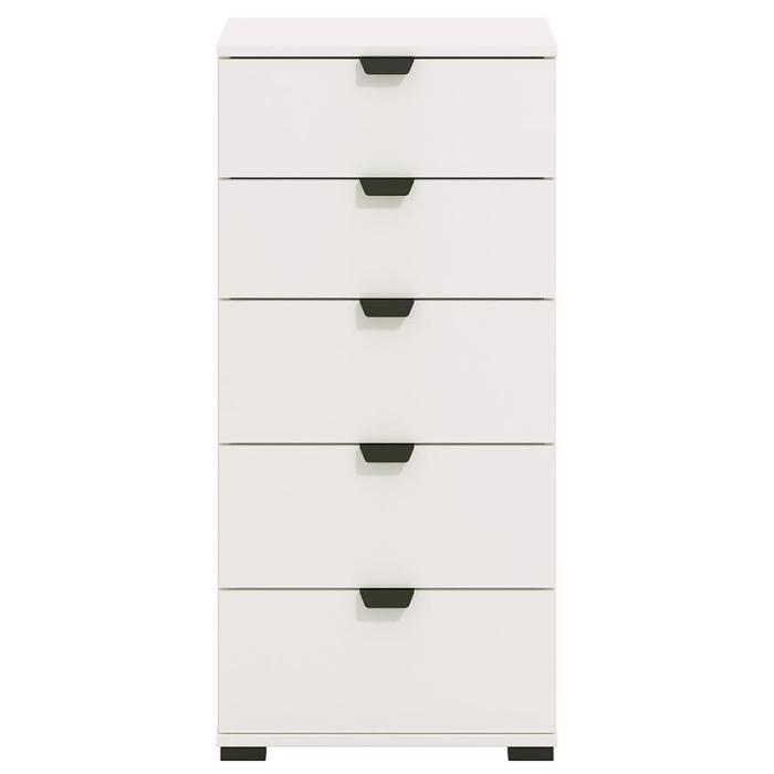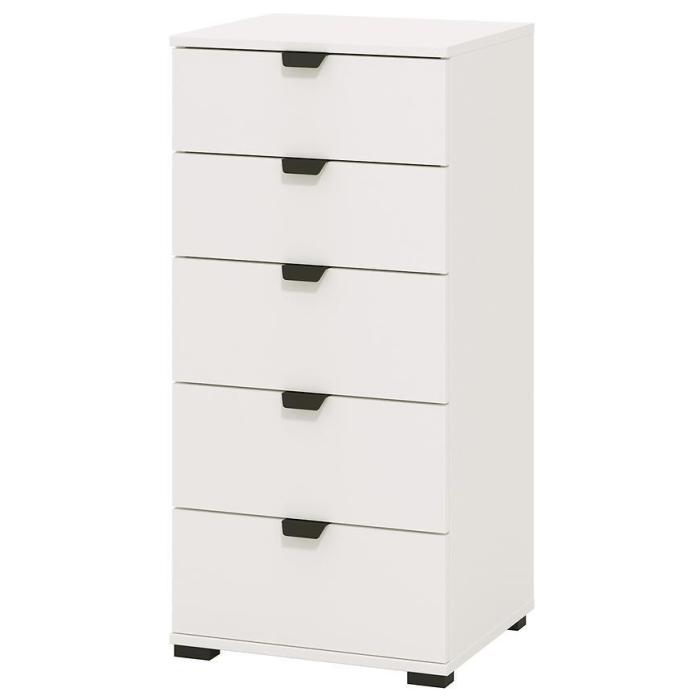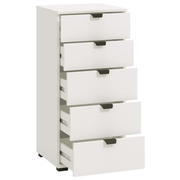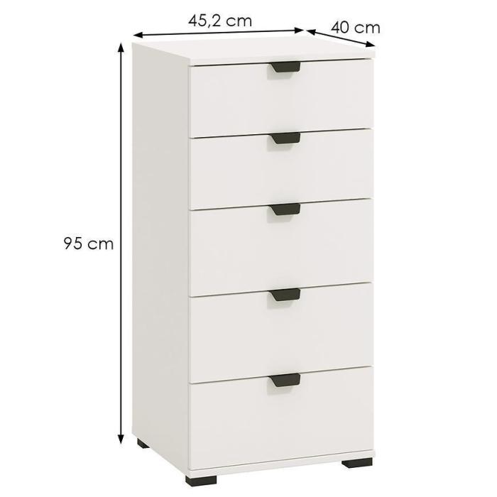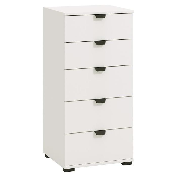 Komoda DUERTO to doskonała propozycja do sypialni lub do przedpokoju. Doskonale sprawdzi się również w pokoju dziennym. Posiada pięć pojemnych szuflad. Wykonana w płyty wiórowej laminowanej. Komoda oferuje funkcjonalne wnętrze, a ponadto wyróżnia się nowoczesnym stylem.