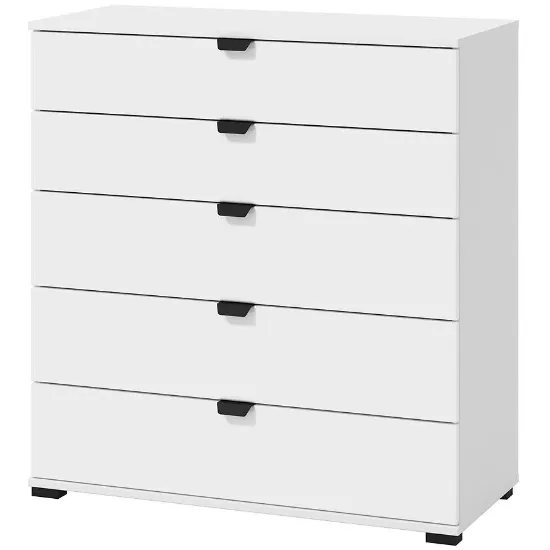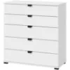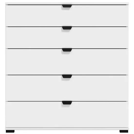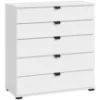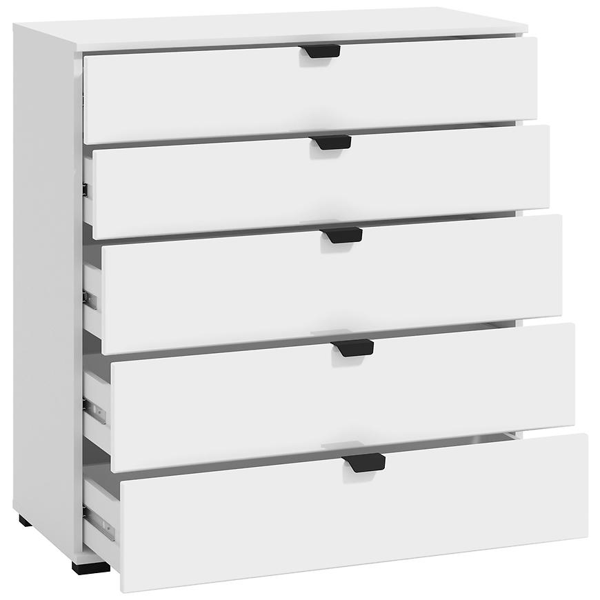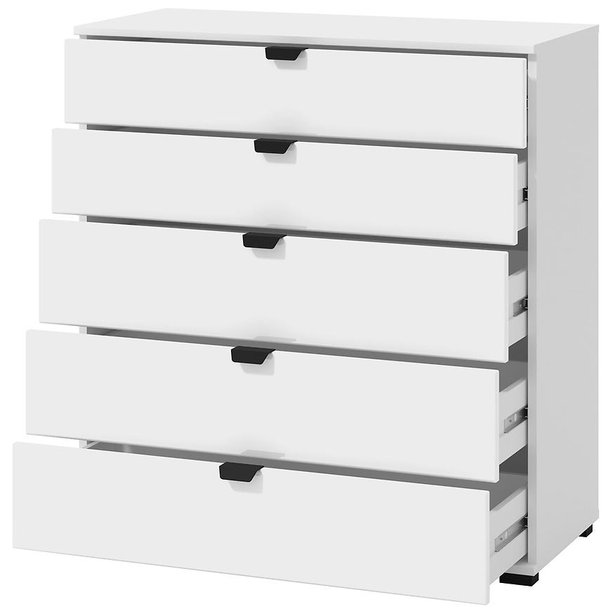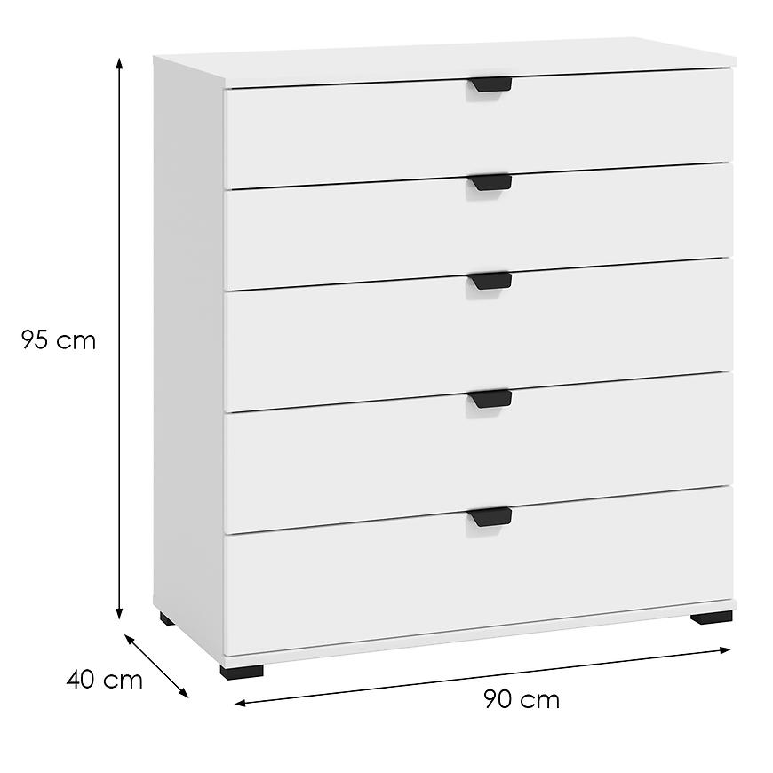 Komoda Duerto to elegancka i funkcjonalna meblościanka, idealna do nowoczesnych wnętrz. Jej pięć szuflad zapewnia dużo miejsca na przechowywanie. Fronty w kolorze białym oraz matowe wykończenie nadają jej nowoczesny wygląd, który doskonale komponuje się z różnorodnymi aranżacjami wnętrz.