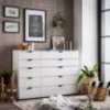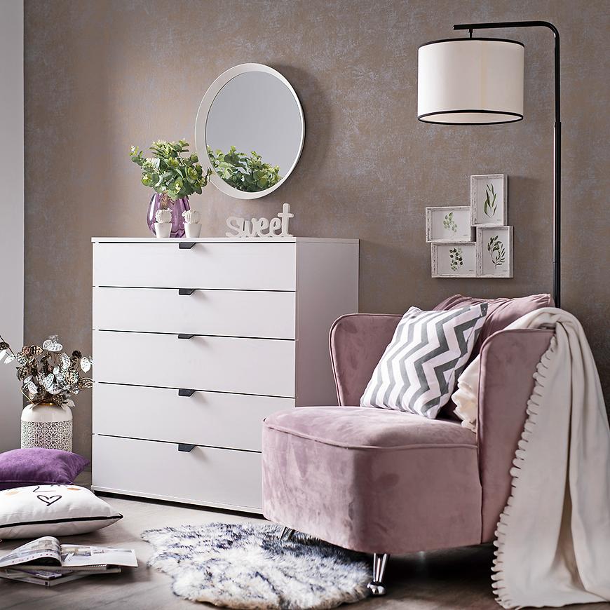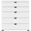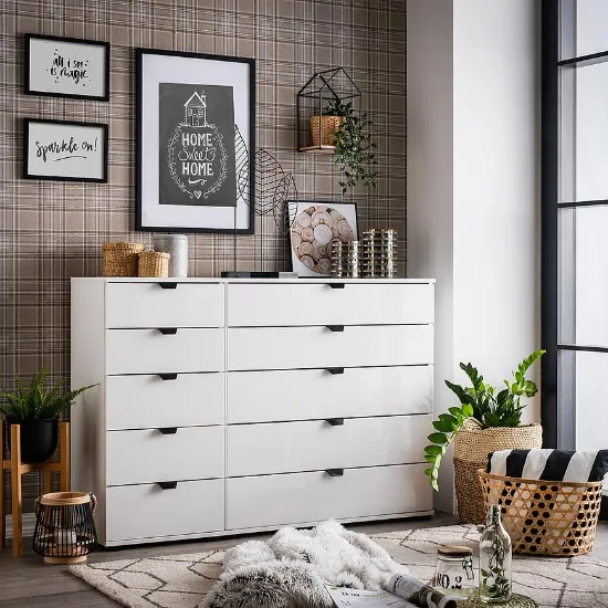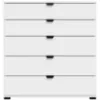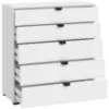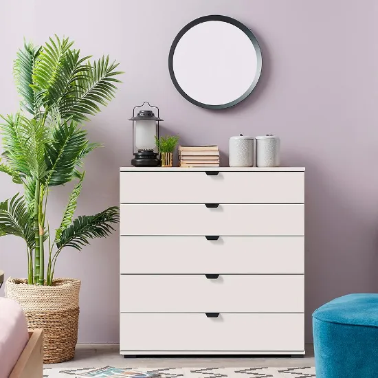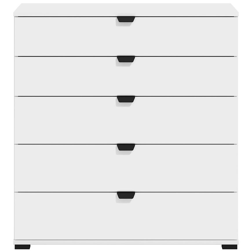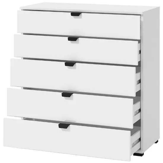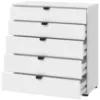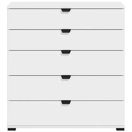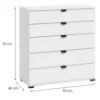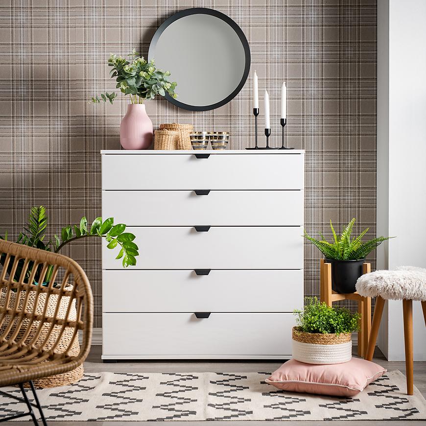Komoda Duerto to elegancka i funkcjonalna meblościanka, idealna do nowoczesnych wnętrz. Jej pięć szuflad zapewnia dużo miejsca na przechowywanie. Fronty w kolorze białym oraz matowe wykończenie nadają jej nowoczesny wygląd, który doskonale komponuje się z różnorodnymi aranżacjami wnętrz.