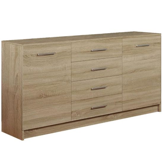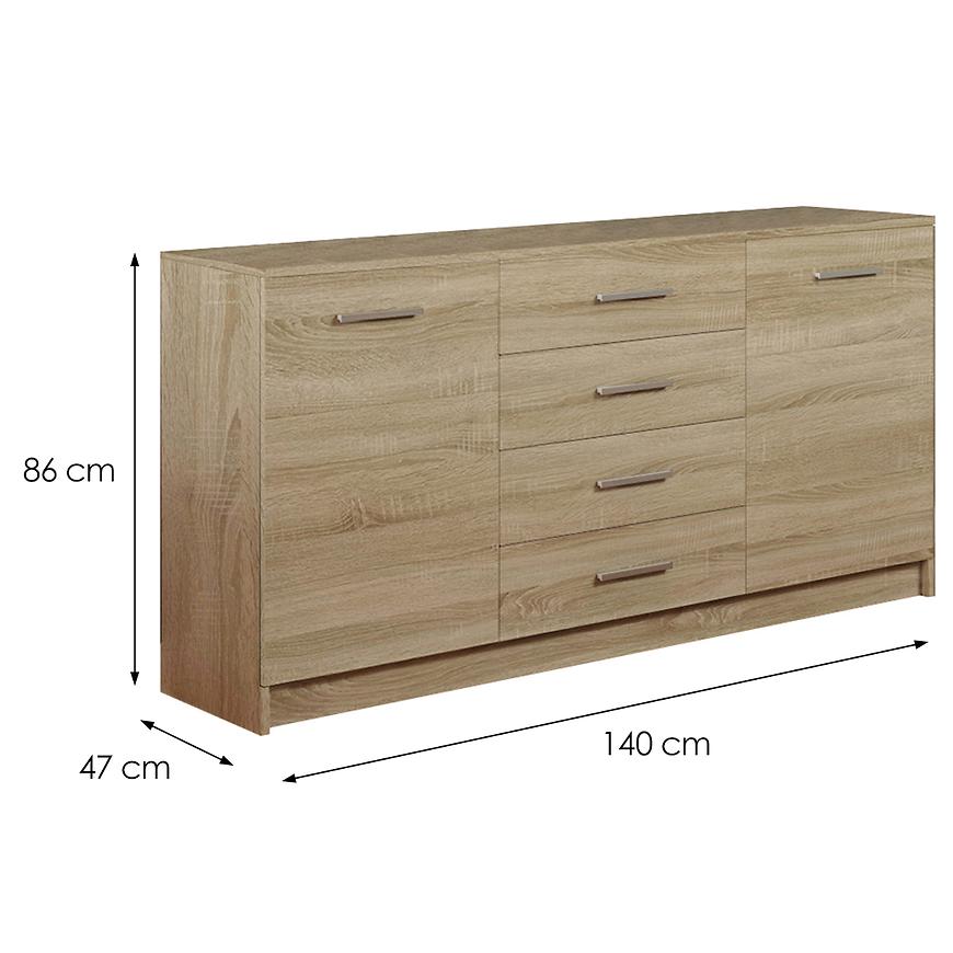 Wykonana z solidnej płyty wiórowej laminowanej, zarówno w konstrukcji frontów, jak i korpusu, komoda DUO 2D4S charakteryzuje się trwałością oraz odpornością na codzienne użytkowanie. Matowe wykończenie zarówno frontów, jak i korpusu dodaje elegancji i sprawia, że mebel ten idealnie wpisuje się w nowoczesne aranżacje wnętrz. Kolor dąb sonoma jest neutralny, co umożliwia łatwe dopasowanie komody do różnych stylów dekoracyjnych oraz kolorystyki pomieszczenia.