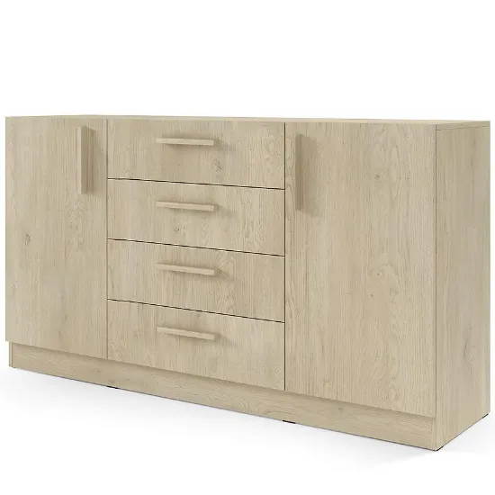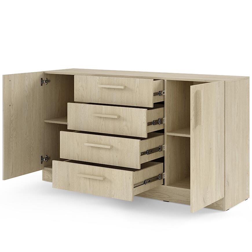 Fronty i korpus wykonano z laminowanej płyty wiórowej, co zapewnia trwałość i odporność na uszkodzenia. Komoda jest łatwa do utrzymania w czystości i dobrze komponuje się z innymi meblami w nowoczesnych wnętrzach.