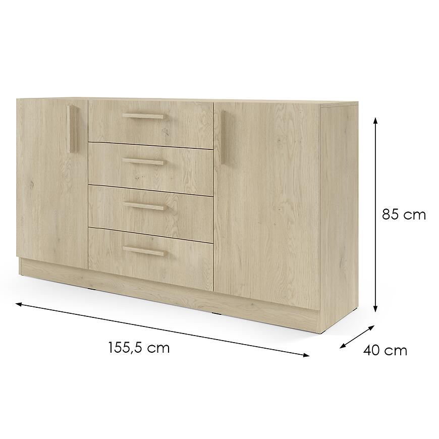 Komoda Braga BRK1 w wybarwieniu dąb cremona to nowoczesny mebel łączący elegancję z praktycznym przechowywaniem. Jej szerokość 155,5 cm i wysokość 85 cm zapewniają dużą powierzchnię użytkową, a głębokość 40 cm umożliwia wygodne przechowywanie różnorodnych przedmiotów.