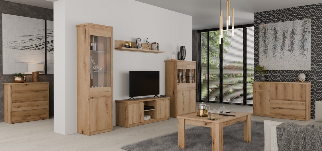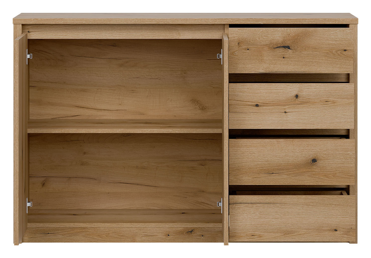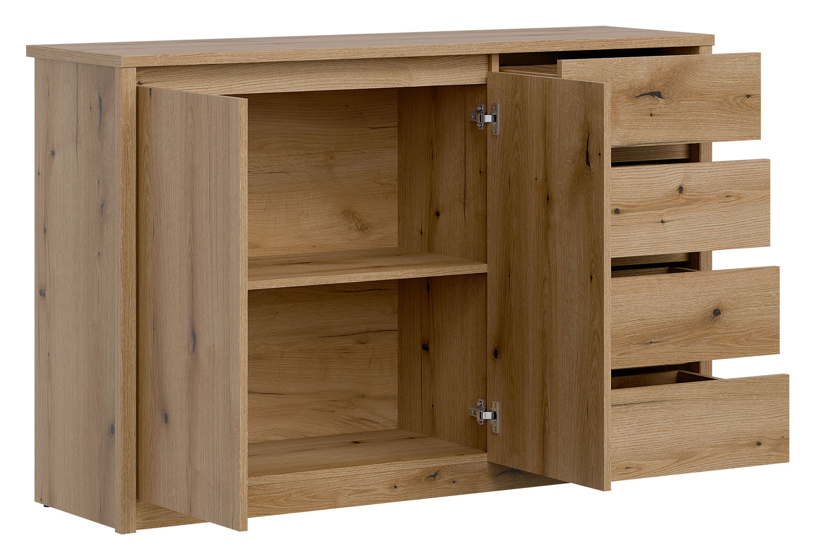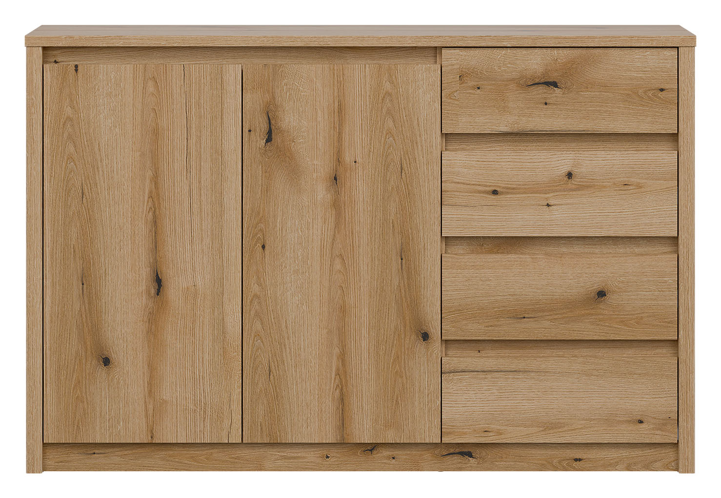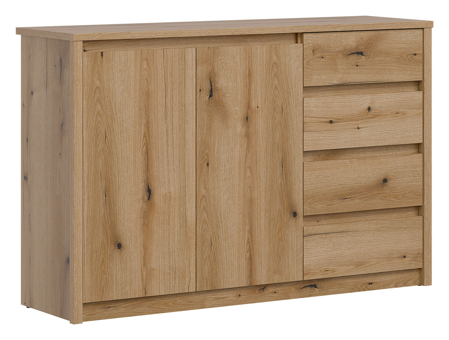 Komoda dwudrzwiowa z czterema szufladami Intenso IT 05 to perfekcyjne połączenie funkcjonalności, elegancji i solidnego wykonania, co sprawia, że staje się ona wyjątkowym dodatkiem do każdego nowoczesnego pokoju dziennego lub jadalni. Wykonana z wysokiej jakości płyty wiórowej laminowanej w dekorze dąb evoke, ta komoda emanuje ciepłem naturalnego drewna, jednocześnie prezentując się nowocześnie i stylowo.