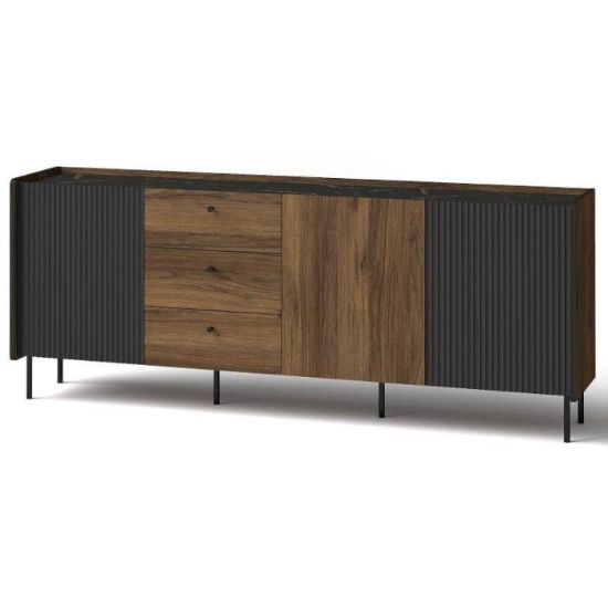 System TIVOLI to nowoczesny system pokojowy w kolorystyce orzech warmia, san sebastian. Na frontach jako element ozdobny zastosowano ryflowane wstawki MDF w kolorze czarnym. Nóżki wykonane z metalu w kolorze czarnym, natomiast uchwyty wykonane zostały z tworzywa sztucznego. Produkt nie posiada oświetlenia LED. Dostępny w paczkach do samodzielnego montażu.