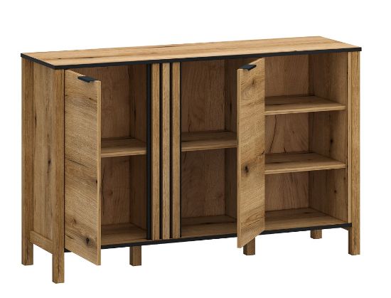 Komoda dwudrzwiowa z drzwiami uchylnymi to nie tylko eleganckie rozwiązanie, ale także praktyczne, zapewniające łatwy dostęp do przechowywanej zawartości. Cztery półki wykonane z trwałej płyty meblowej umożliwiają uporządkowane przechowywanie, idealne dla tych, którzy cenią sobie porządek.