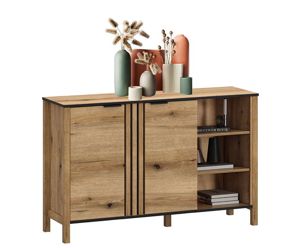 Komoda dwudrzwiowa Helios 5 to doskonały przykład harmonii pomiędzy funkcjonalnością a estetyką. Wykonana z wysokiej jakości płyty meblowej laminowanej, jej elegancki design wnosi do przestrzeni nowoczesność i styl. Kolor dąb evok nadaje meblowi naturalny urok, a matowe wykończenie podkreśla jego wyjątkowy charakter.
