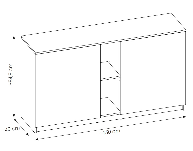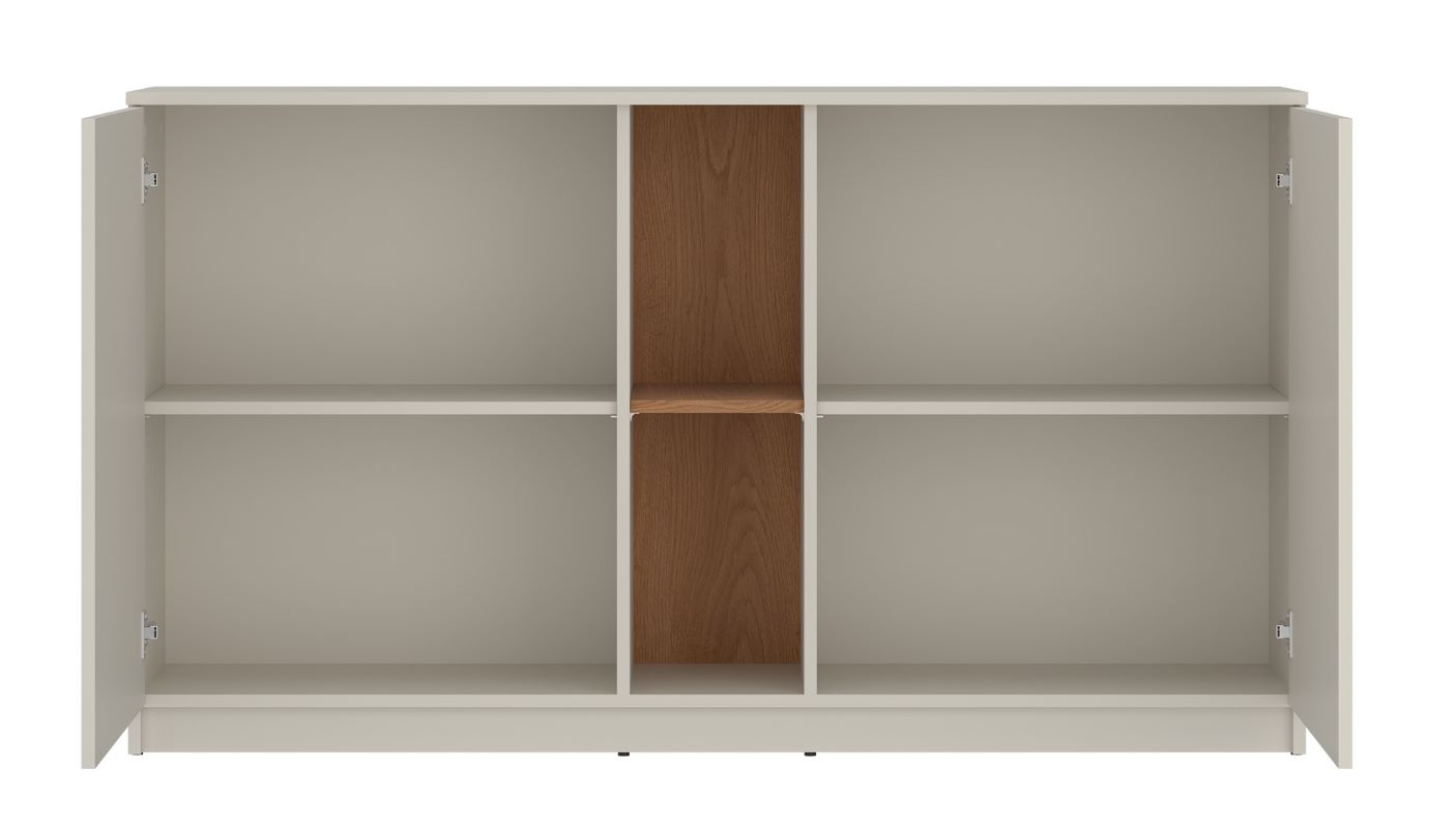 Komoda Fano 2D została wyposażona w dwa fronty drzwiowe skrywające przestronne półki, które ułatwiają segregację przedmiotów, oraz otwarte półki w środkowej części, idealne do wyeksponowania książek, dekoracji lub elektroniki. Szeroki blat komody to dodatkowe miejsce na lampkę, rośliny czy ozdobne akcesoria, które podkreślą indywidualny styl wnętrza.