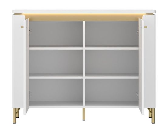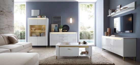 Kolekcja Lazio to połączenie elegancji, luksusu i nowoczesnych rozwiązań, stworzone z myślą o aranżacji pokoju dziennego lub jadalni. Zaprojektowana w stylu glamour, zachwyca przemyślanym zestawieniem matowej i błyszczącej bieli z delikatnymi akcentami złota, które nadają meblom wyjątkowego charakteru. To propozycja dla osób ceniących wyrafinowany design, wysoką jakość wykonania oraz praktyczne funkcje użytkowe.
