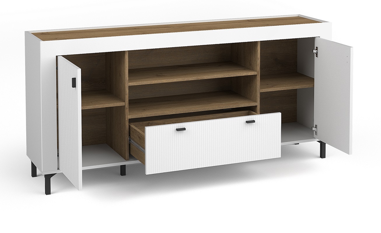 Komoda charakteryzuje się białym matowym wykończeniem zarówno korpusu, jak i frontów, co nadaje jej elegancki i uniwersalny wygląd. Fronty komody posiadają subtelny efekt prążkowania, który dodaje meblowi nowoczesnego charakteru. Korpus oraz fronty zostały wykonane z płyty meblowej, co zapewnia trwałość i odporność na uszkodzenia. Drzwi uchylne ułatwiają dostęp do wnętrza, a głębokość komody wynosząca 40 cm sprawia, że jest ona kompaktowa i jednocześnie przestronna, idealnie pasująca do różnych rozmiarów pomieszczeń.
