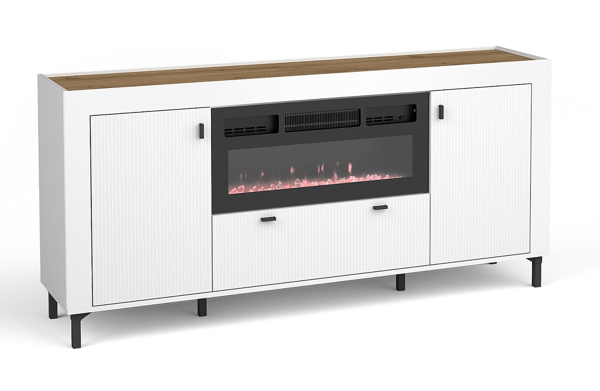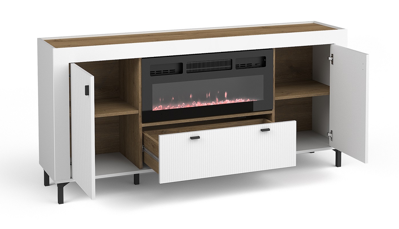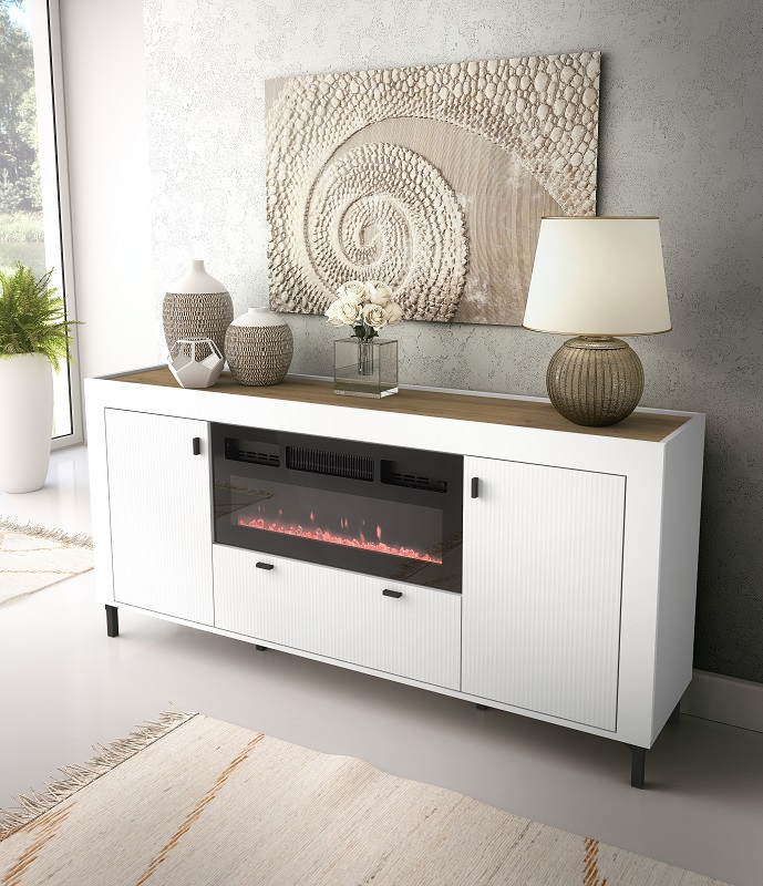 Jednym z atutów komody Mossa MO7 jest możliwość zamontowania kominka elektrycznego nad szufladą. Kominek, który jest opcją dodatkową płatną, może stanowić eleganckie i funkcjonalne uzupełnienie wnętrza, dodając mu przytulności i ciepła. To rozwiązanie jest idealne dla osób, które chcą wzbogacić swoje wnętrze o dodatkowy element dekoracyjny i funkcjonalny.