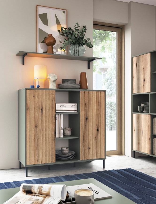 Dzięki unikalnemu połączeniu zieleni, drewna i metalu, komoda dwudrzwiowa Pozzi 2D świetnie komponuje się z różnorodnymi stylami wnętrzarskimi.