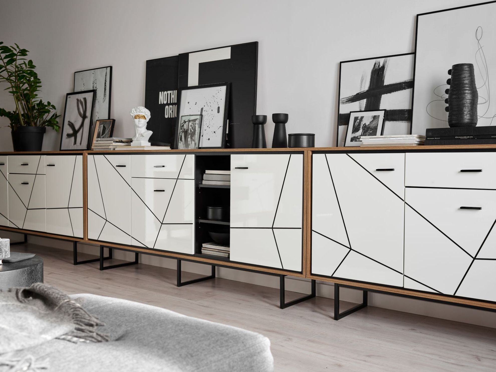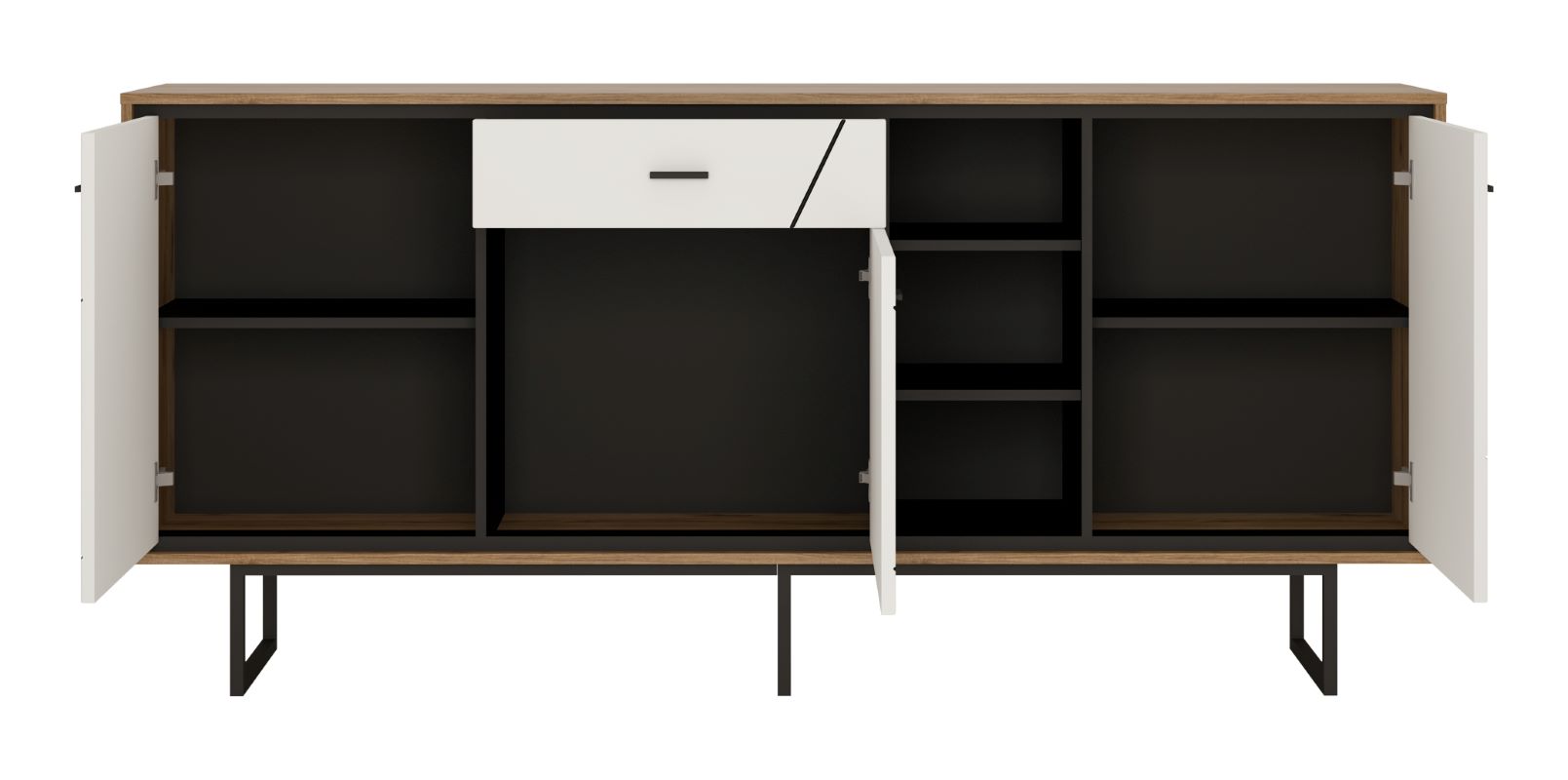 Wnętrze komody zostało zaprojektowane z myślą o maksymalnej praktyczności – trzy pojemne wnęki umożliwiają przechowywanie różnorodnych przedmiotów, a jednocześnie stanowią idealne miejsce do eksponowania ulubionych dekoracji. Szuflada z prowadnicami kulkowymi o pełnym wysuwie zapewnia wygodny dostęp do przechowywanych rzeczy, a zawiasy z cichym domykiem gwarantują komfort użytkowania i chronią fronty przed uszkodzeniami.